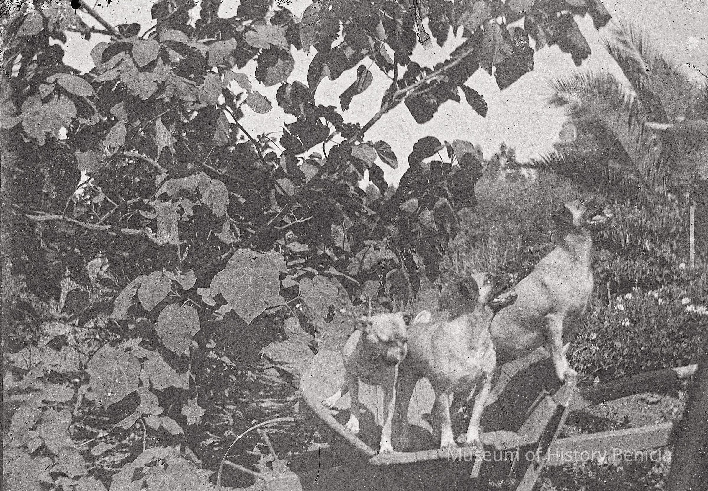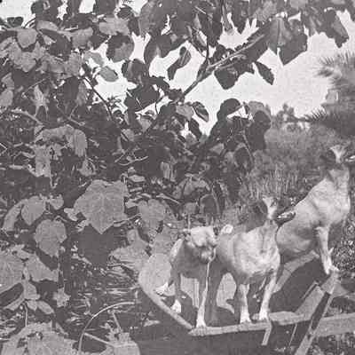 Photo of three dogs in a wheelbarrow outside byn a tree.