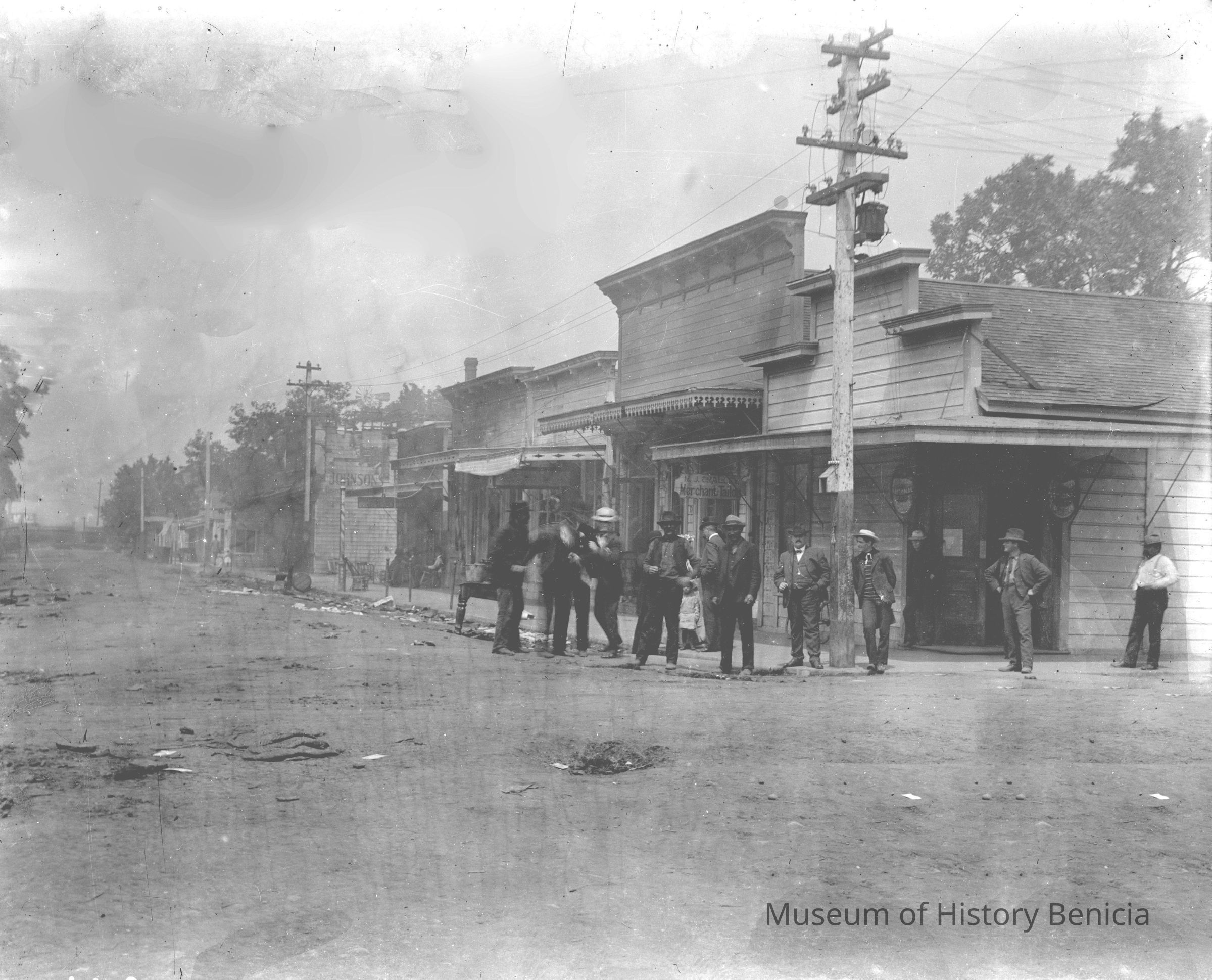 Men outside a saloon. Dirt streets location unknown but could be Martinez. The guy in the stripped shirt is in most of the 08/16/1904 shots of Martinez after the big fire there. The man in the doorway of the saloon looks like John Molfino. Sign identifies M.J. O'Malley Merchant Tailor and Johnson's a burned out building.Collection