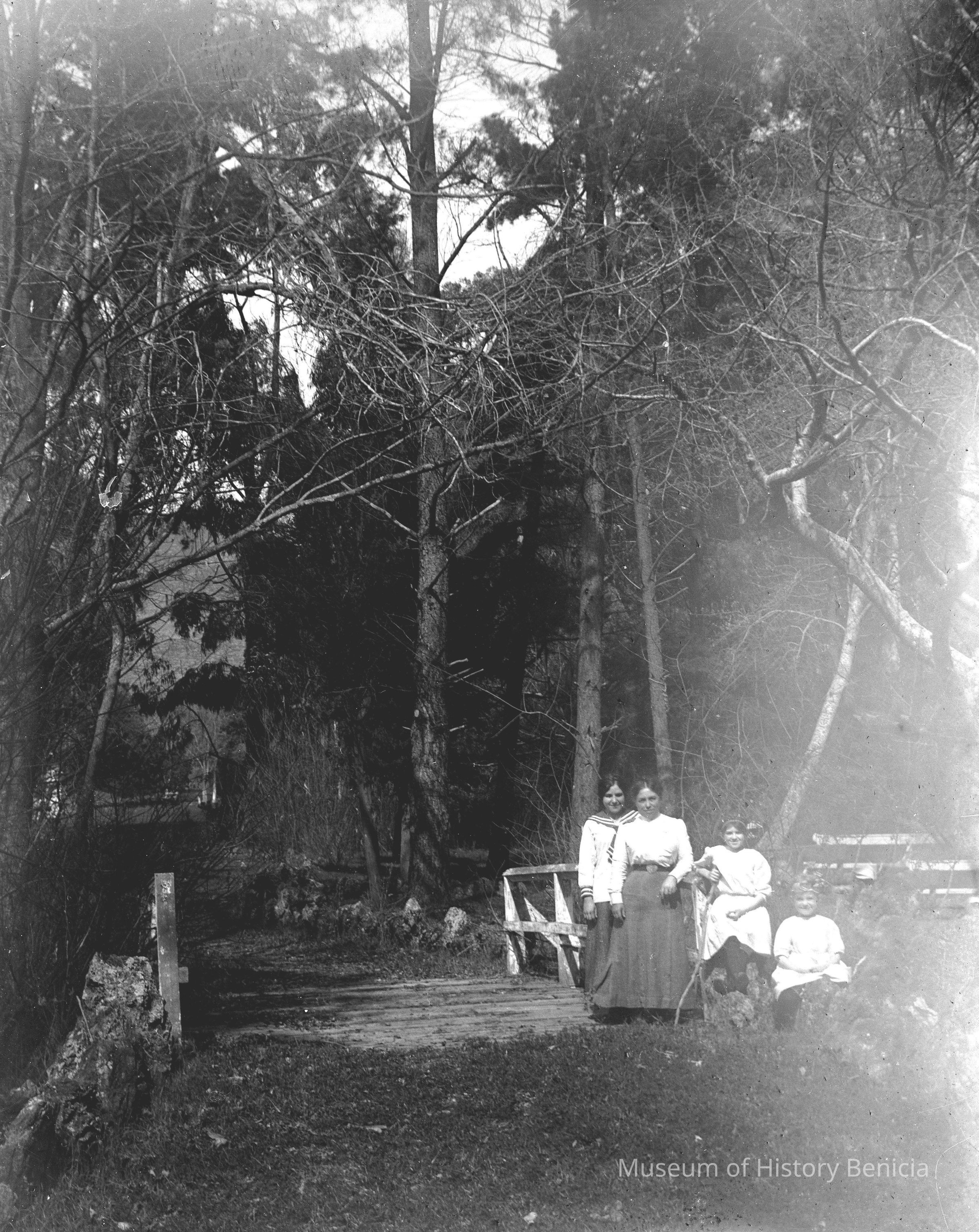 Dita, Violet and Margarite Molfino with another young woman on a trail in the woods.
