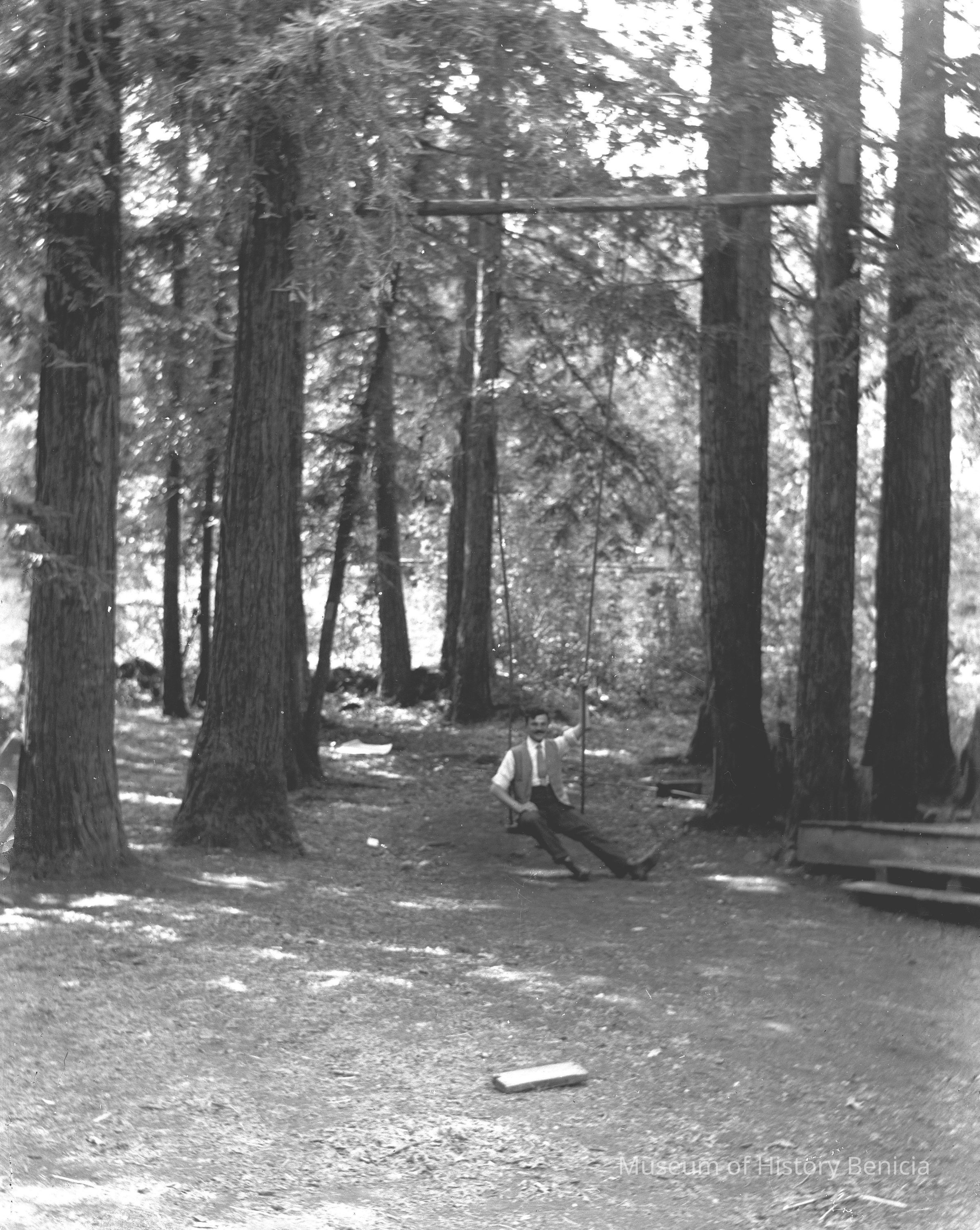 John Molfino in a swing in the woods. The swing is suspended from a log braced between two trees.