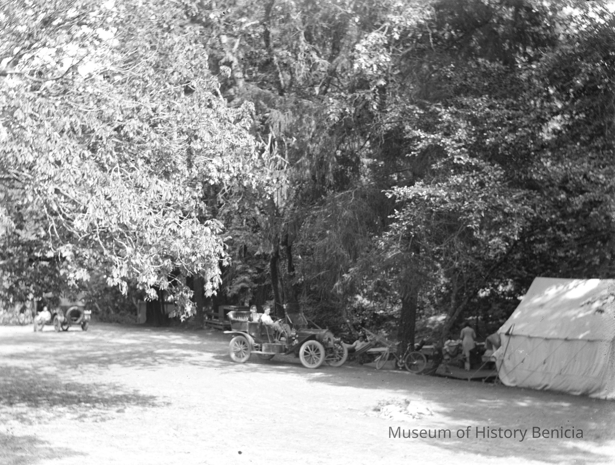 Two cars. A man and woman in one of the cars, a man on a hammock, and a woman next to a tent at a campground. There is a bicycle leaning against a tree.