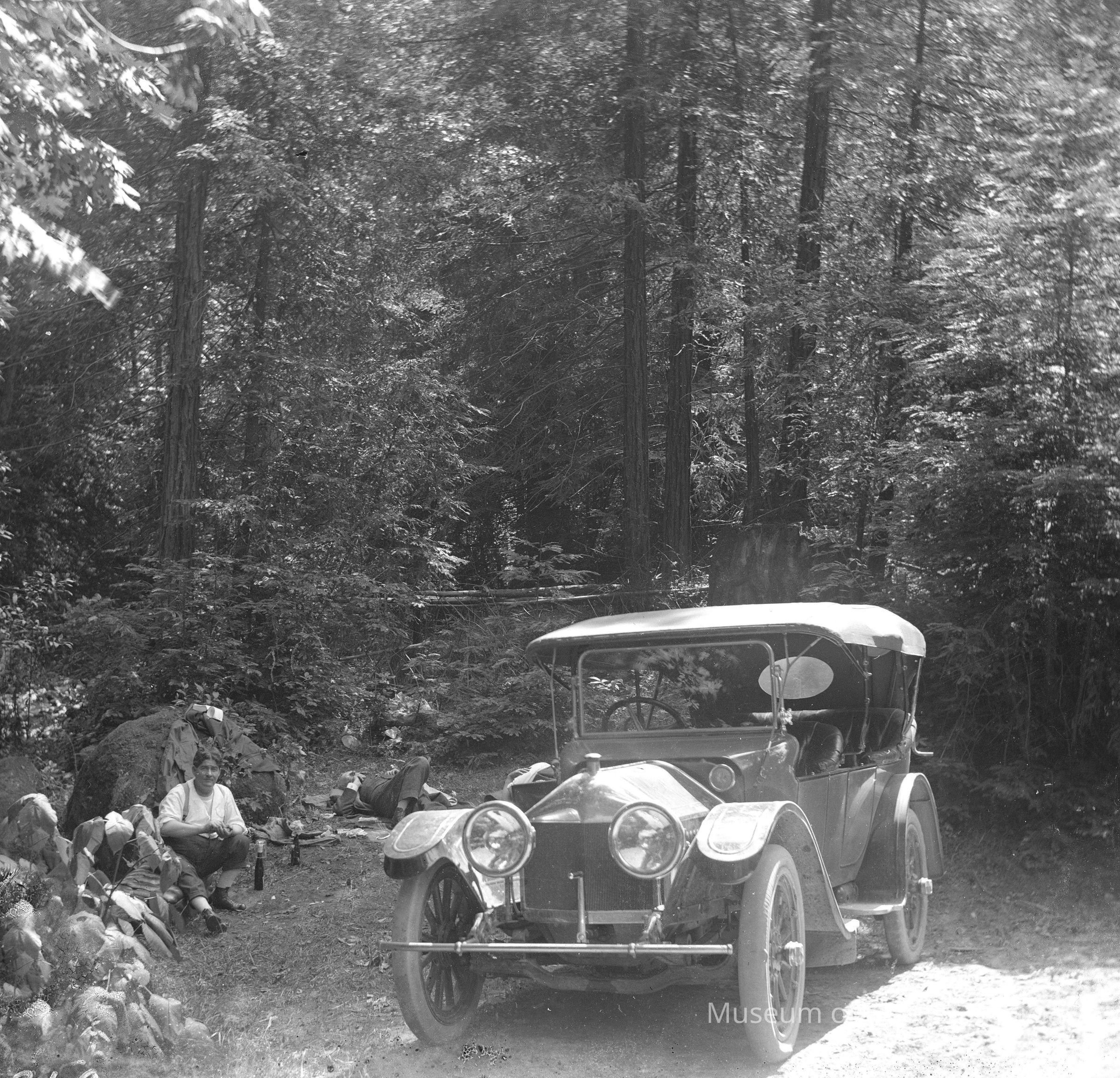 An old car (early model, Model T?) and a man sitting to the left in a dense forest.
