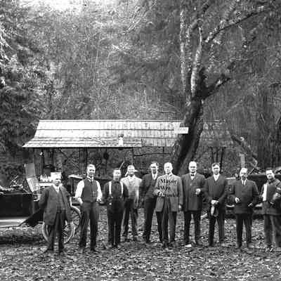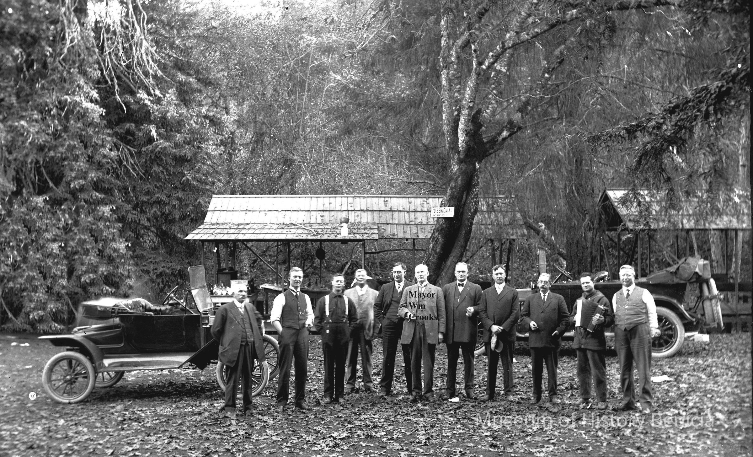 Group of men on an outing. Notice the sign on the tree that points the way to the Benicia-Martinez ferry.