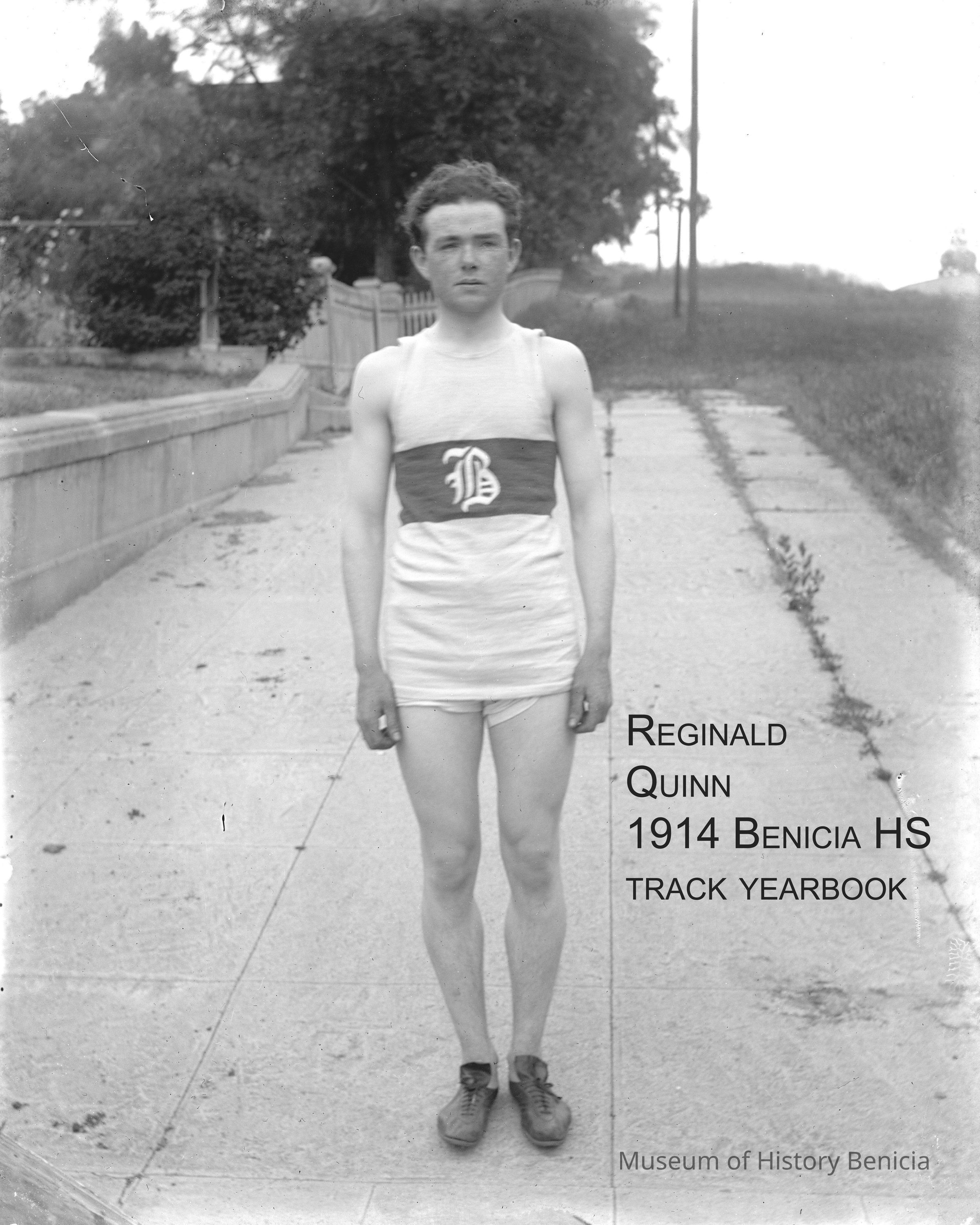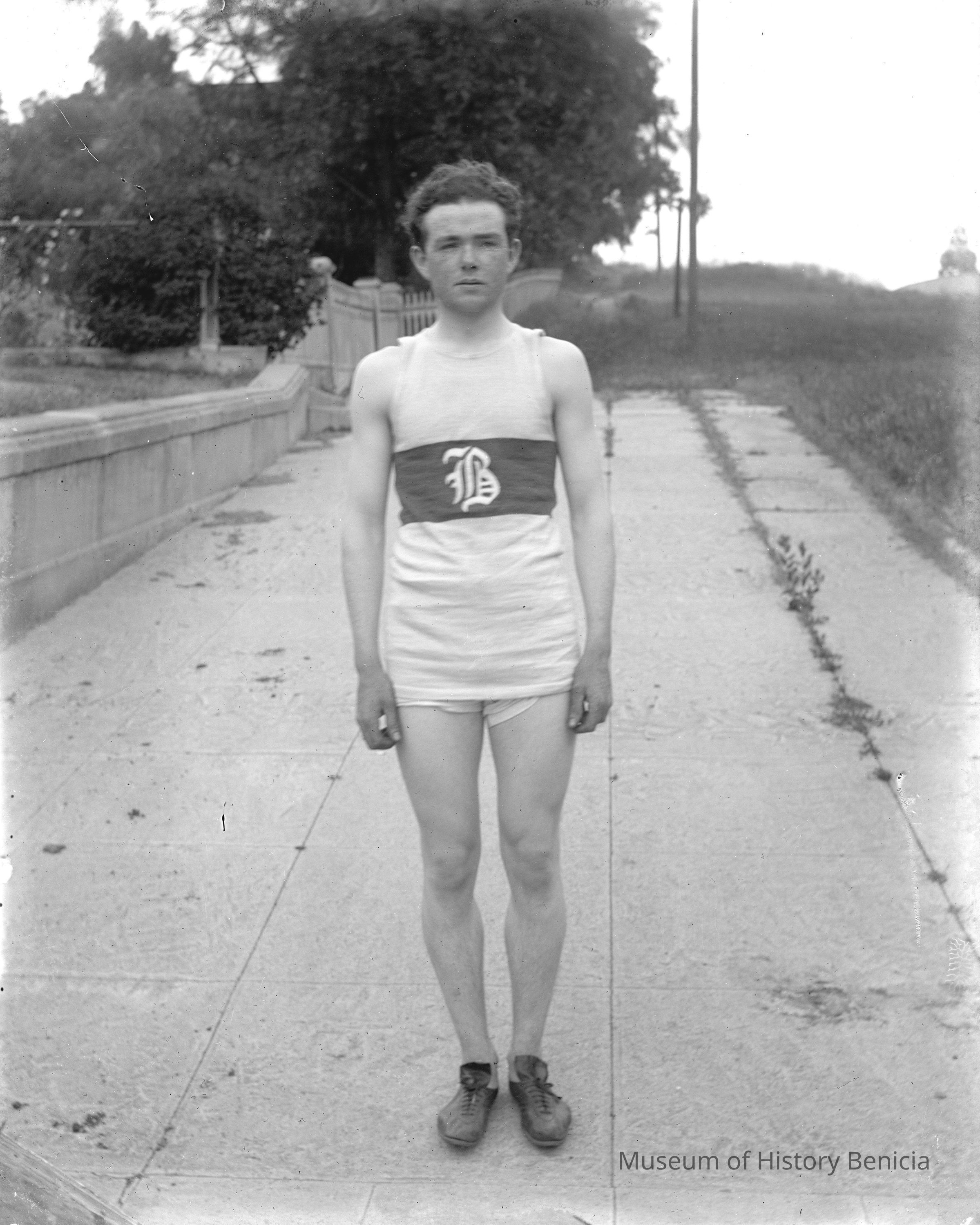 Benicia high school athlete (track) on sidewalk near Hastings Mansion. Per the 1914 Benicia High School yearbook this is Reginald Quinn. This photo was taken by John Molfino for the yearbook.Collection