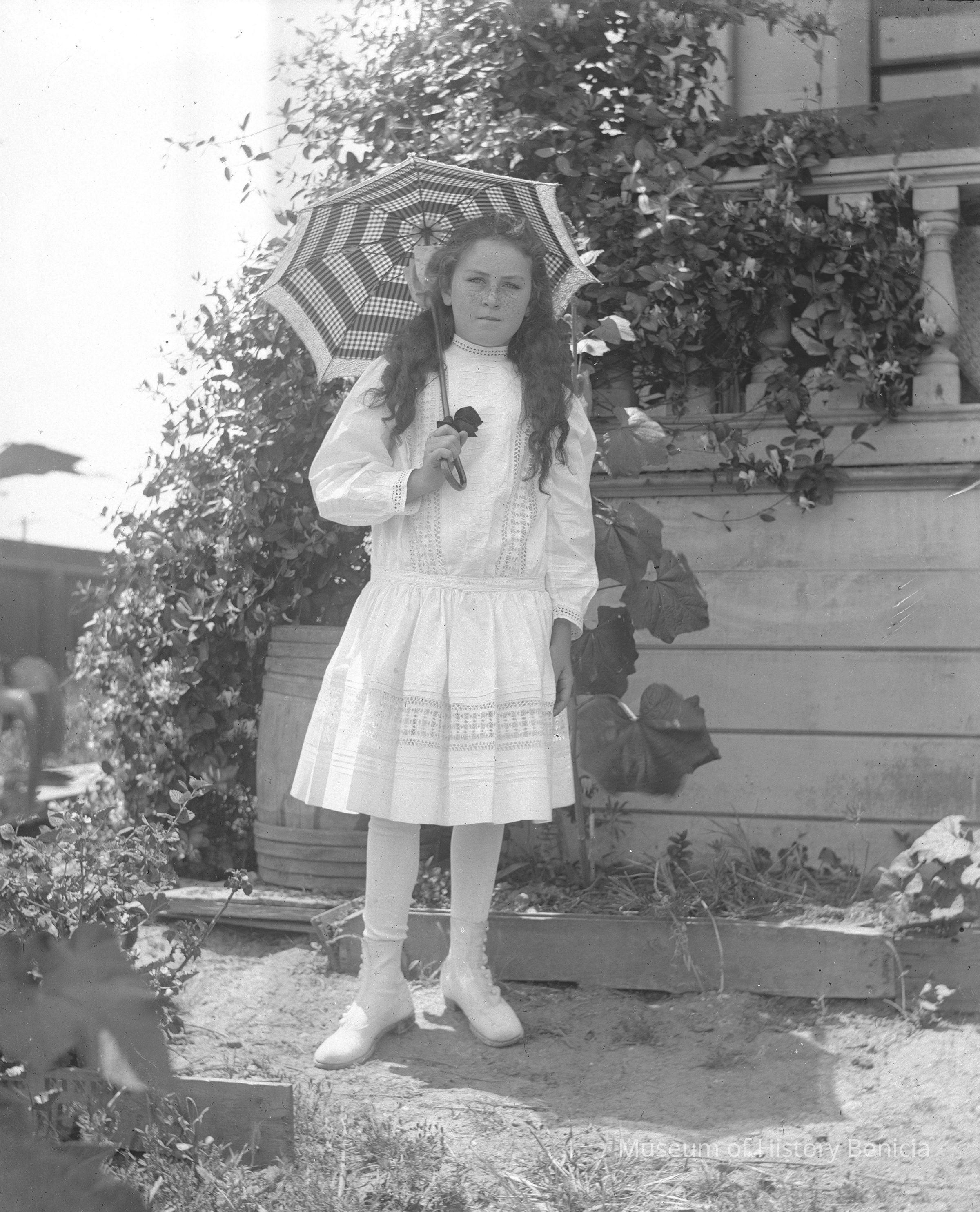 Same girl as in 330 & 331 but wearing a different dress and in front of house near rain barrel.