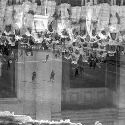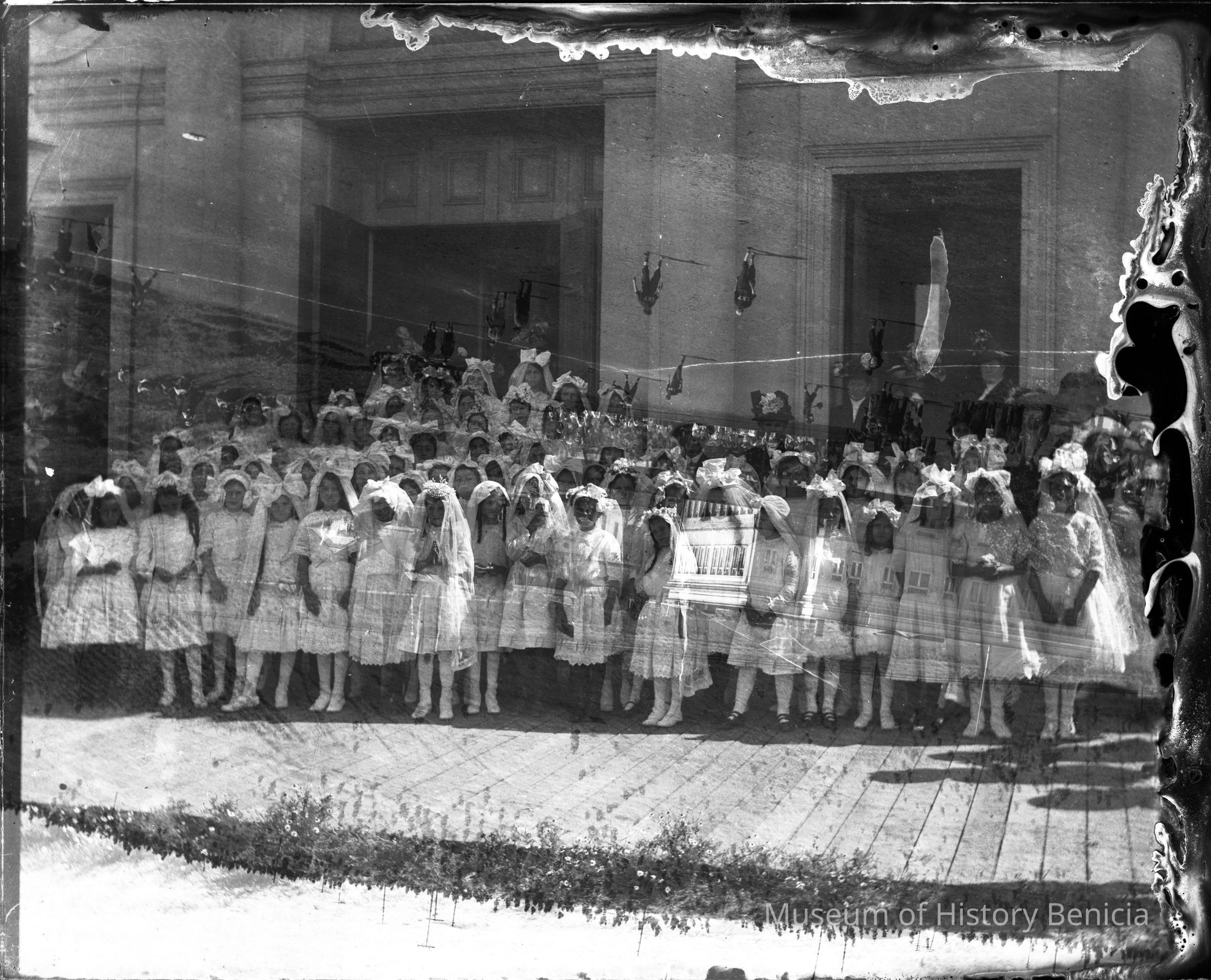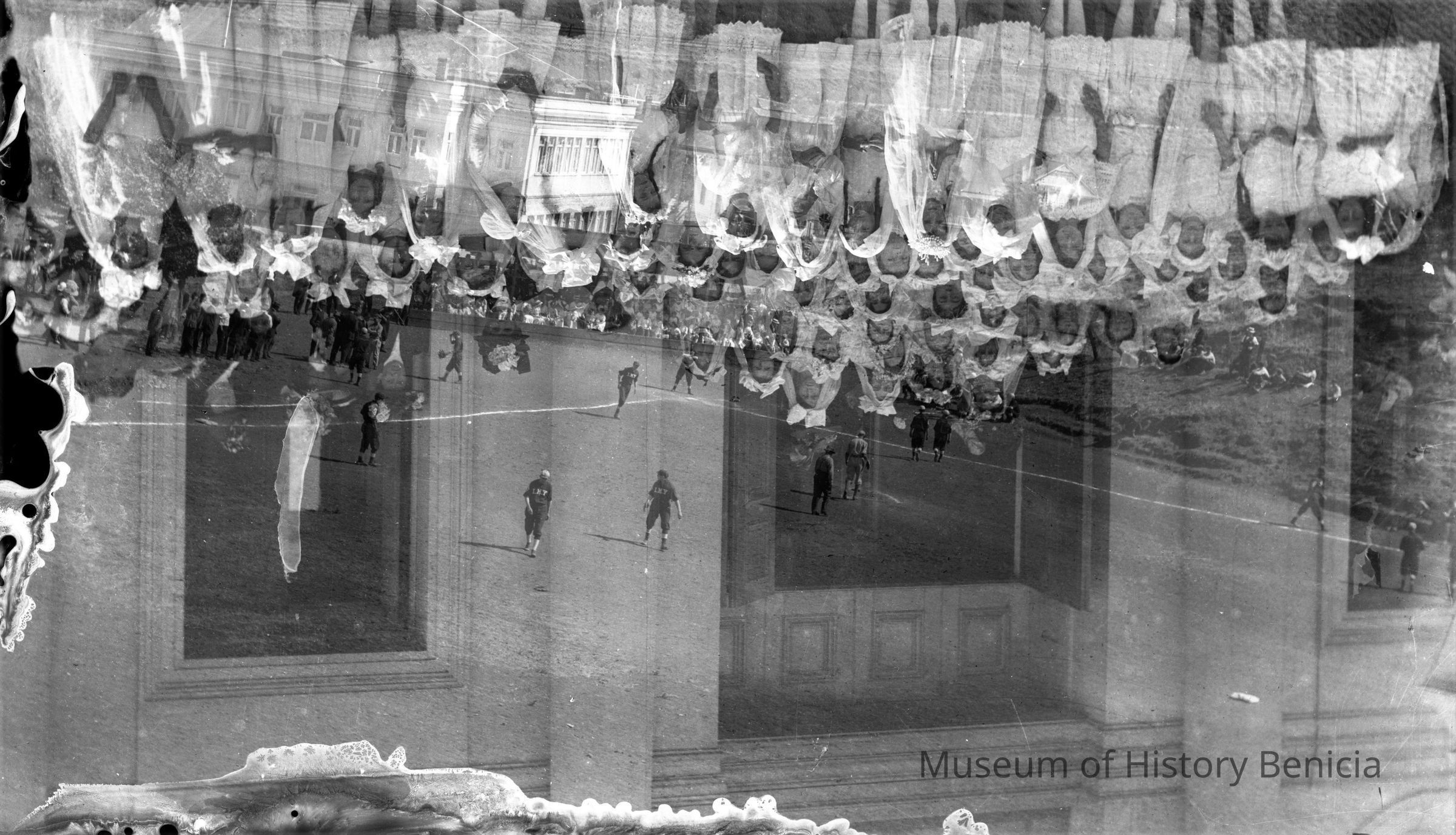 (two glass negatives stuck together) First image is of a group of people standing outside of an unidentified building. Second image is unclear but looks like a baseball game.Collection