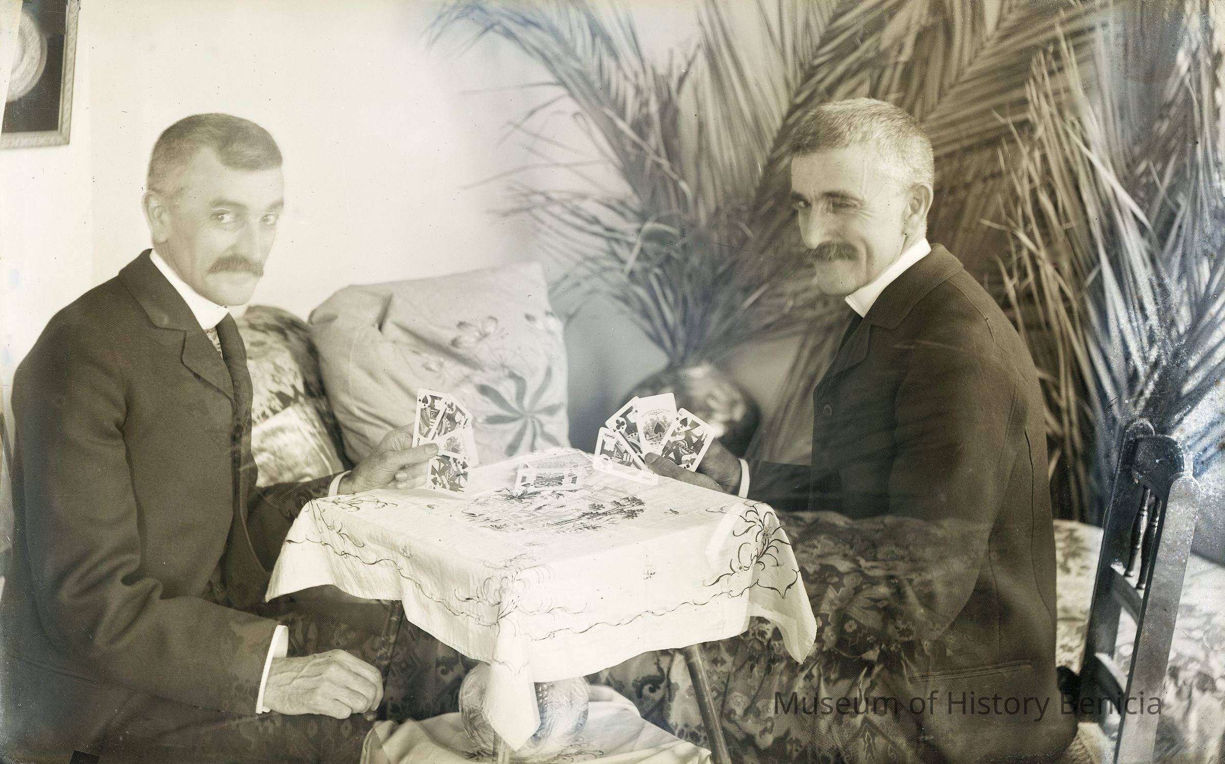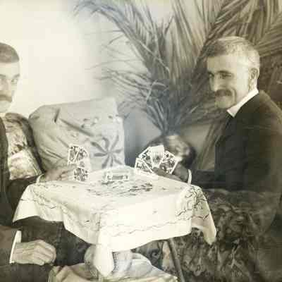 glass plate negative. The photo shows Franklin Fish playing cards with himself. This is a trick photo.