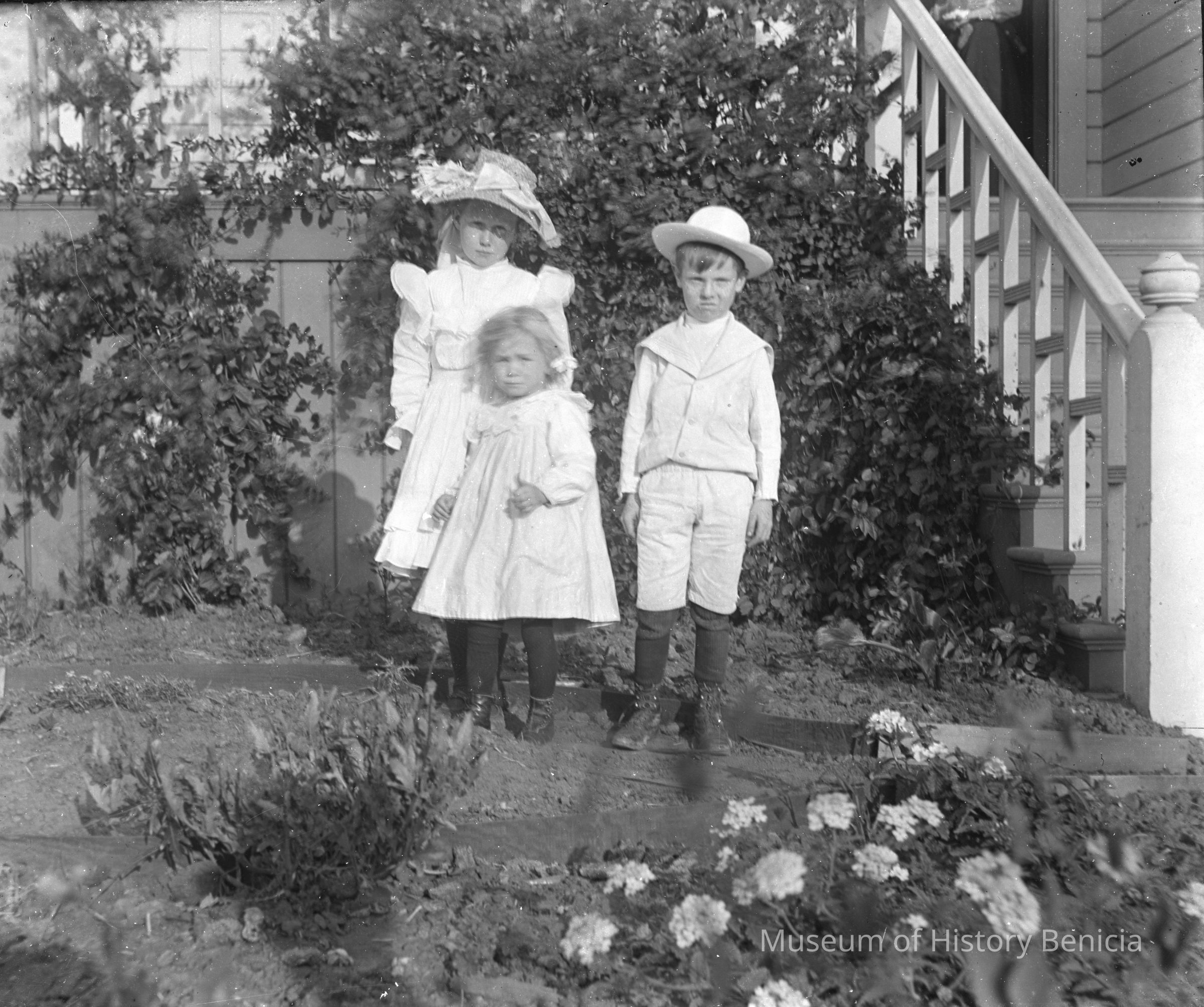 Three children in a garden. This may be the backyard of the house at 2332 Castro Way in Sacramento which was owned by Ralph and Marguarite Myers (John Molfino's daughter).Collection