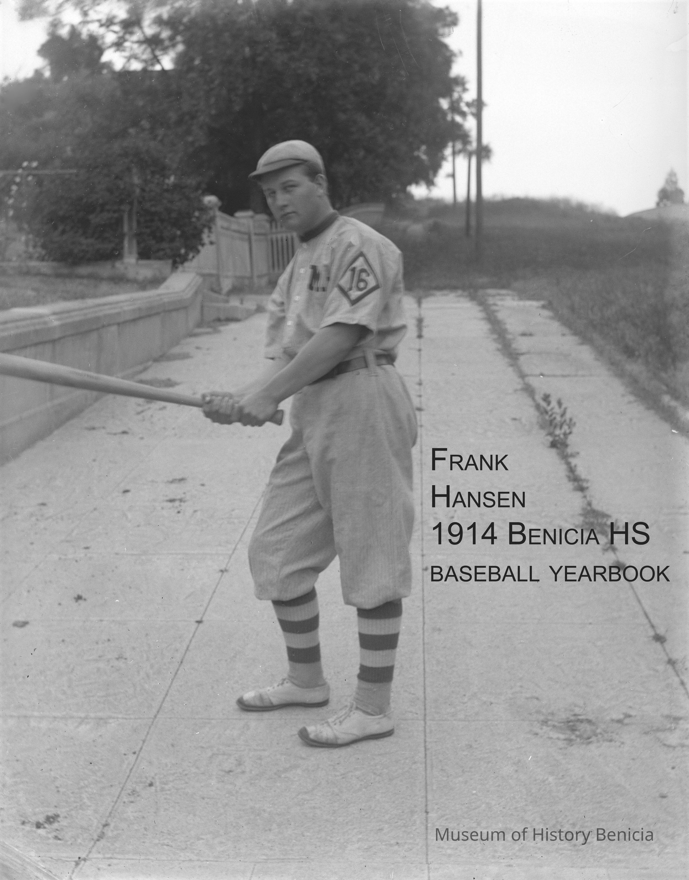 Benicia high school baseball player in front of the Hastings mansion wearing a YMI (Young Men's Institute) uniform. Per the 1914 Benicia High School yearbook this is Frank Hansen. This photo was taken by John Molfino for the yearbook.Collection