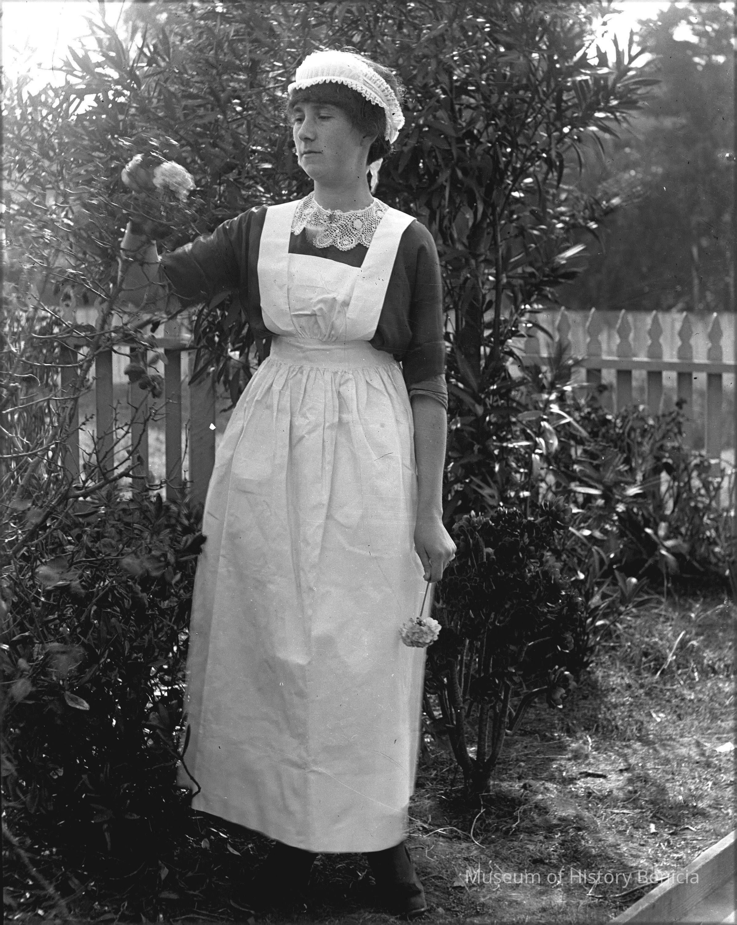 Woman in a maid's outfit in the garden.
