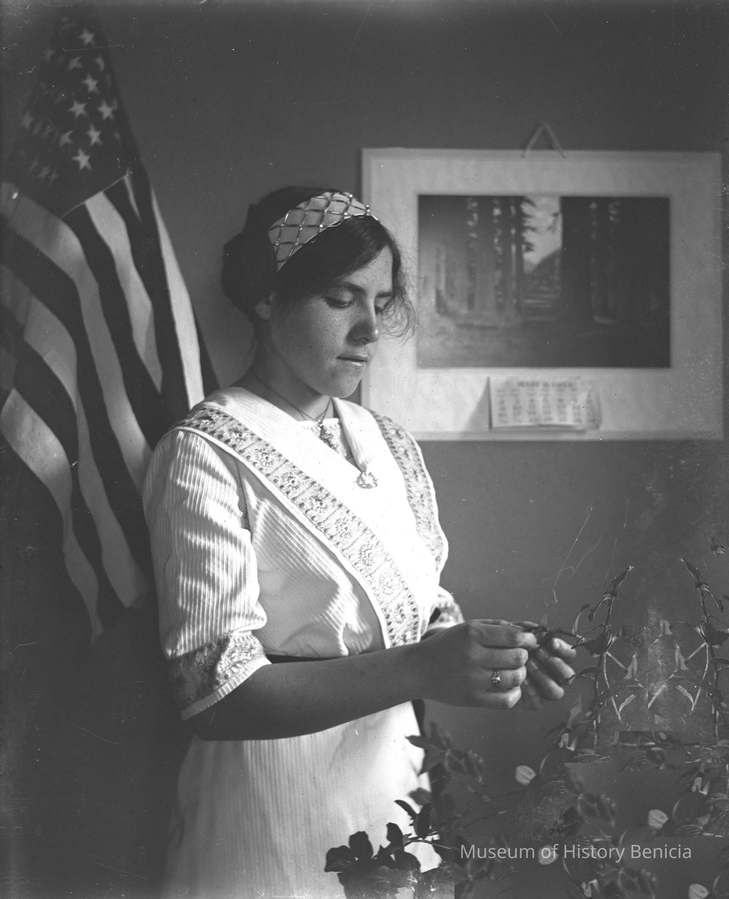 Woman in white uniform in a room with flowers and the American flag. This could be Molfino's daughter Margurite who was a dietician in a hospital.Collection