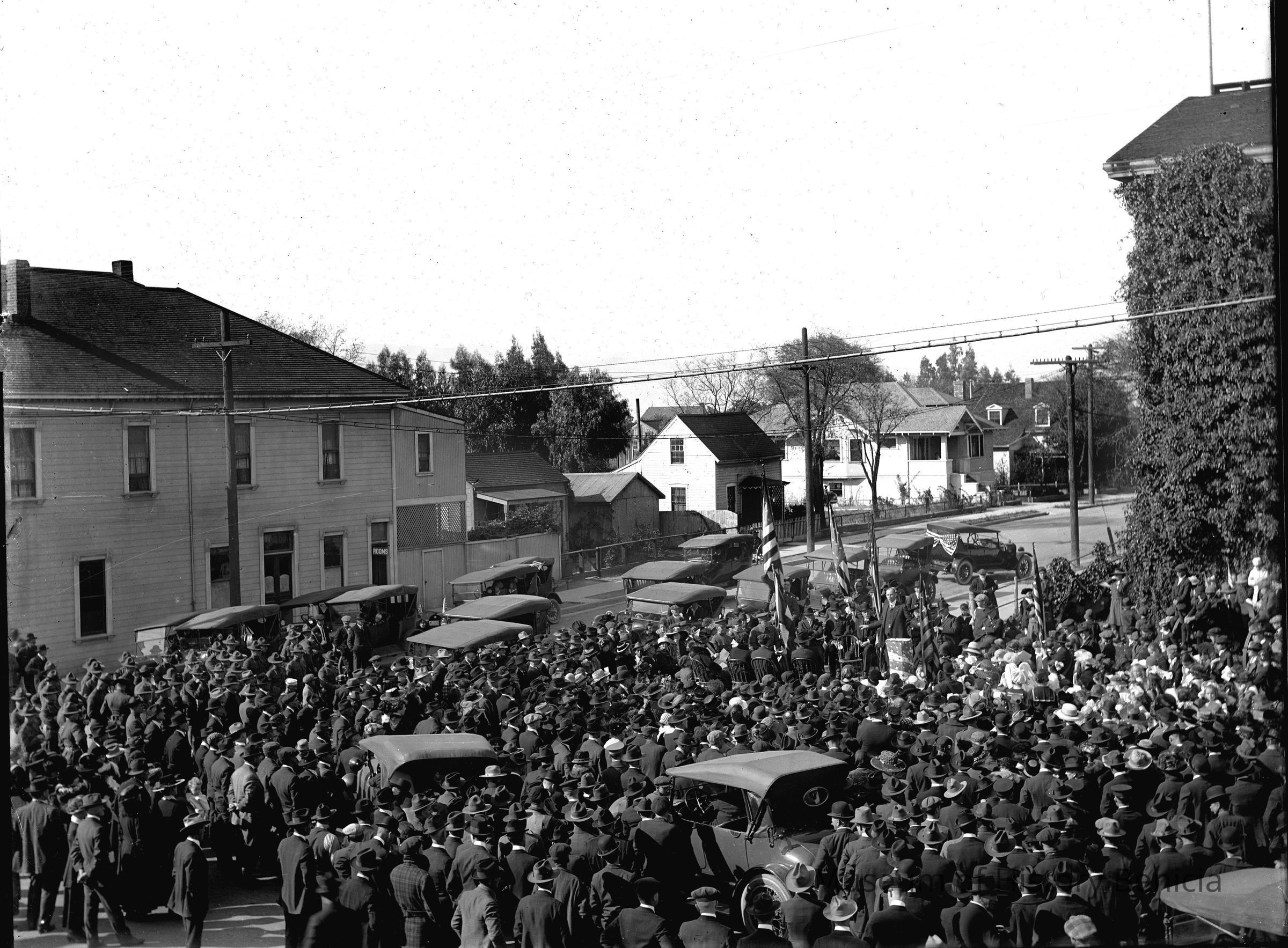 First St. scene, corner of First and "G" streets. There is a crowd of people in attendance to a program. People and vehicles are gathered in front of the Capitol Building.Collection