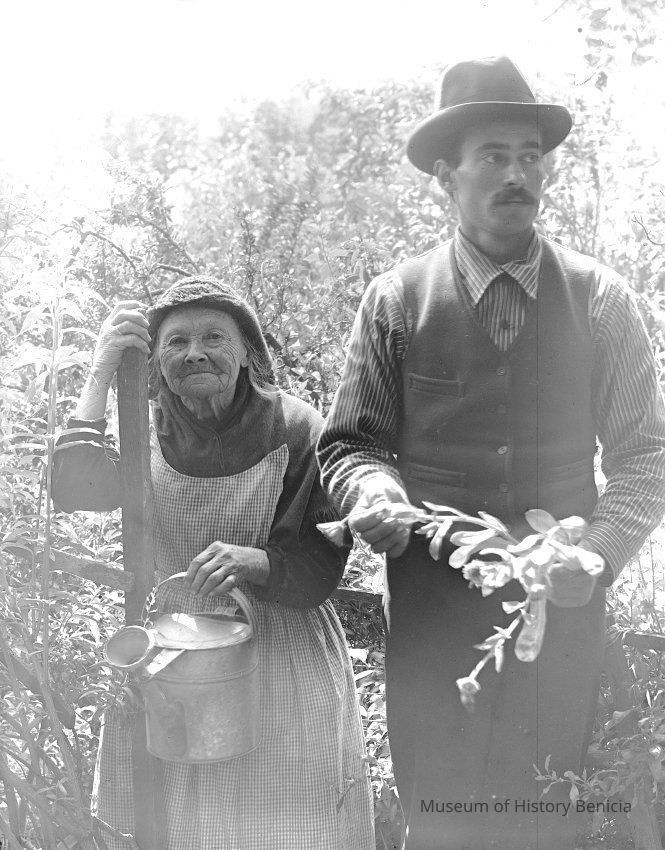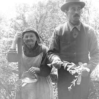 Photo of a farmer and a very old woman holding a watering can.