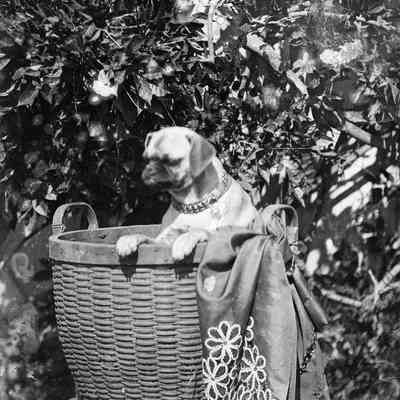 A photo of a dog in a basket.