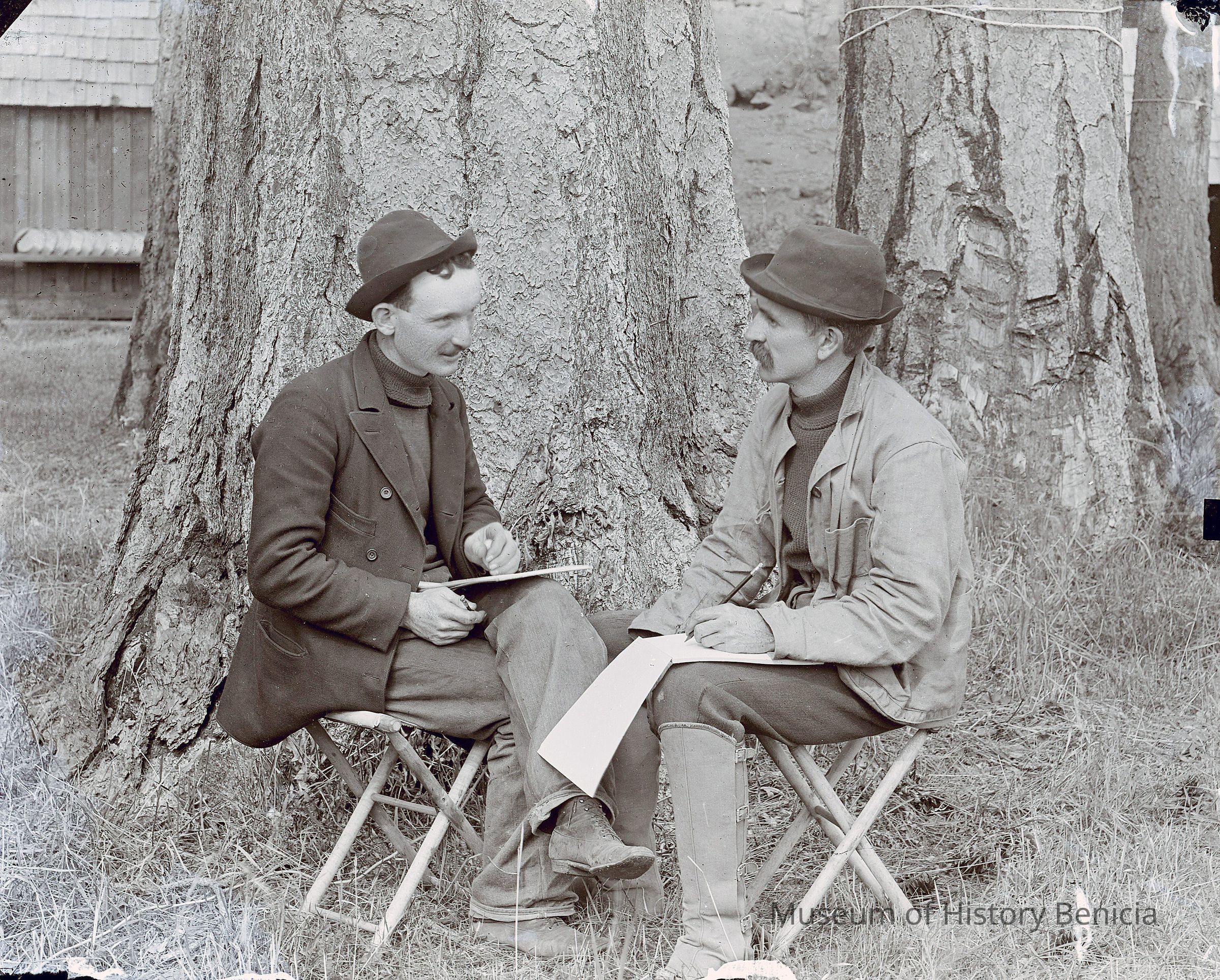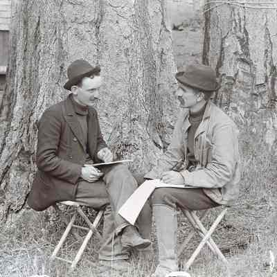 Photo of two men talking next to a tree. The man on the right looks like Franklin Fish (see 2012.011.0002)