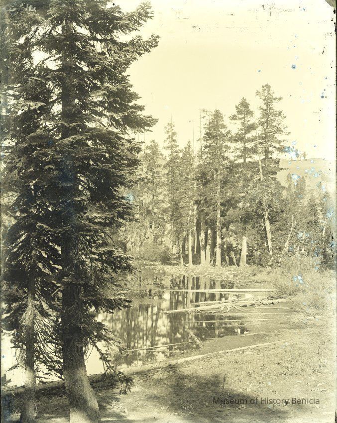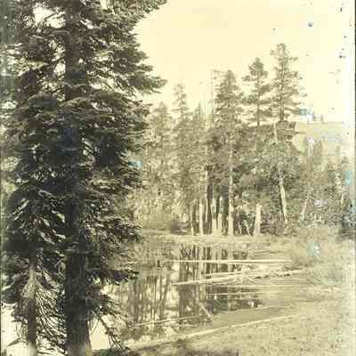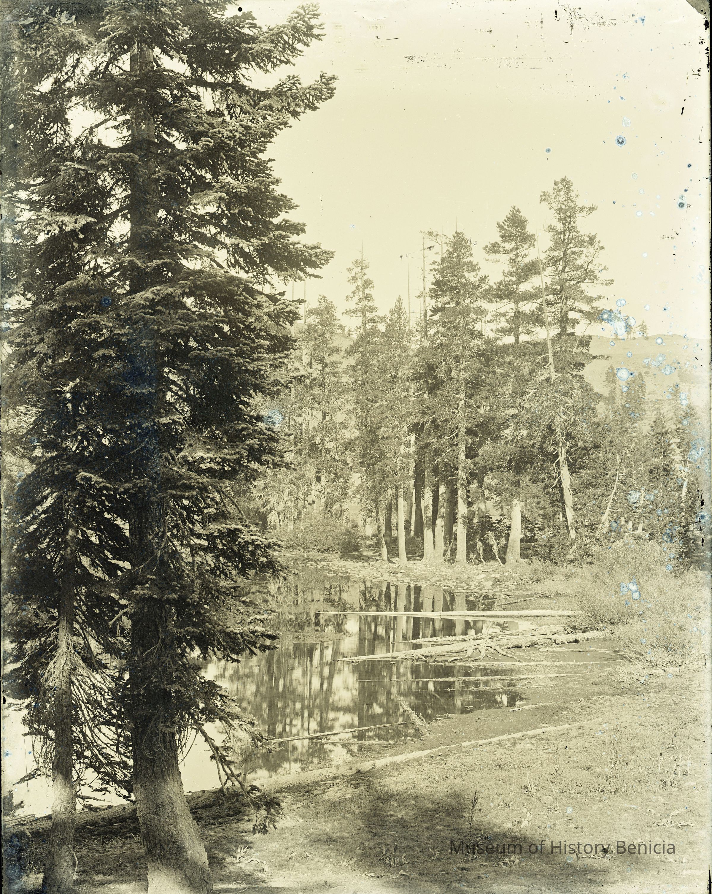 glass plate negative. Shows a lake with logs washed up on shore. Seems to be the same lake as in 2012.011.0559.