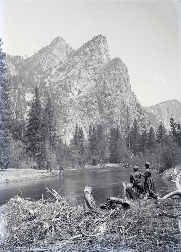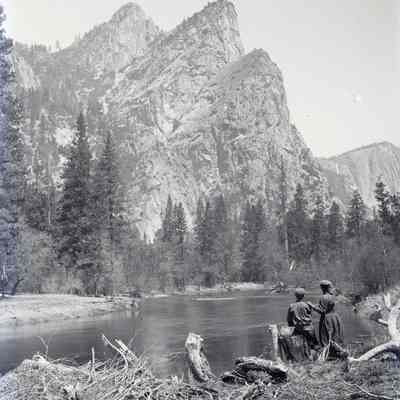 glass plate negative from plate box identified as "box 5" It shows two people, a young man and a woman, next to a river. There is a three pointed rocky outcropping across the river and a waterfall far off in the distance. May be Yosemite.