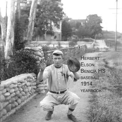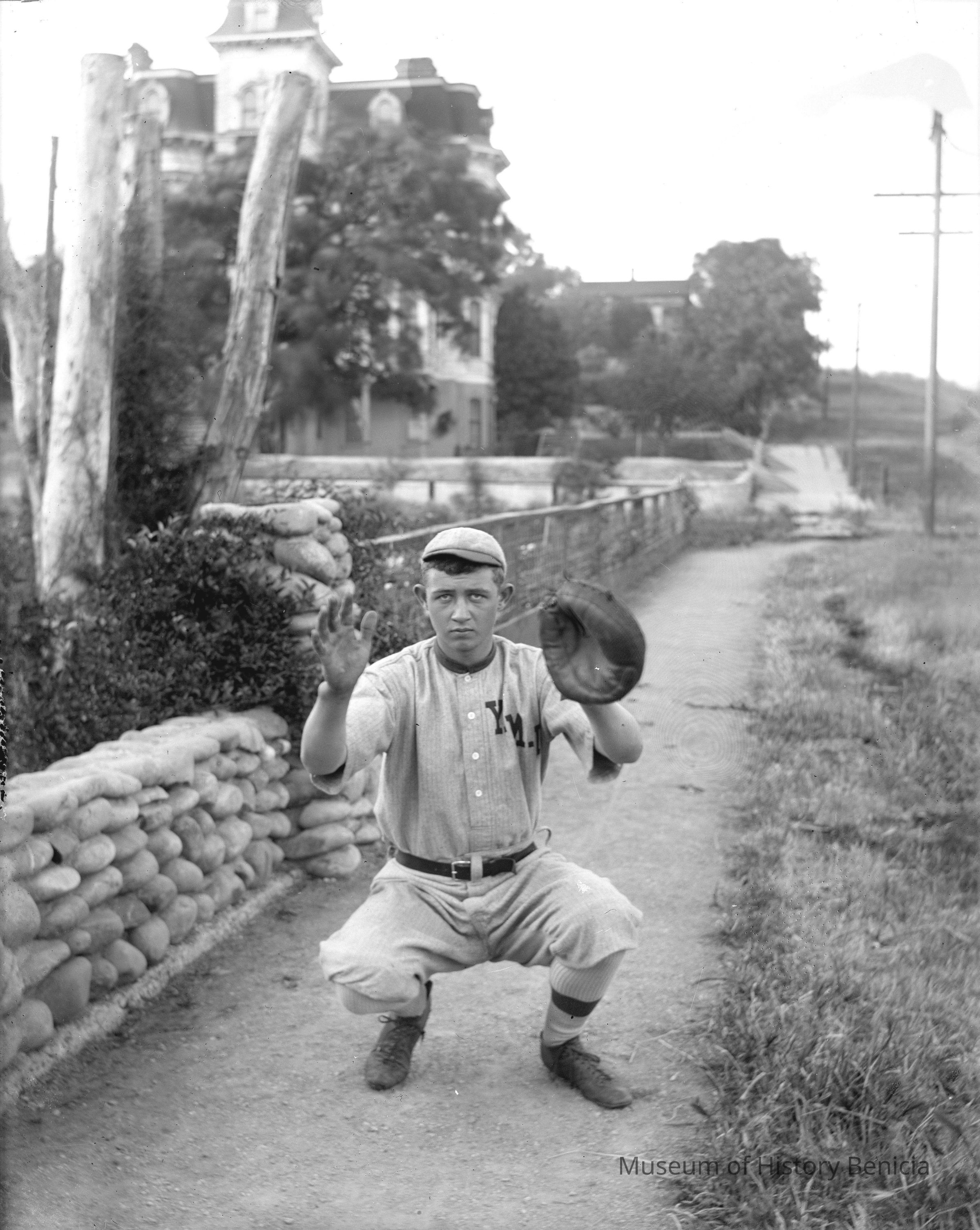 Benicia high school baseball player in front of 1121 West Second street with Hastings mansion in the background and wearing a YMI (Young Mens Institute) uniform. Per the 1914 Benicia High School yearbook this is Herbert Elson. This photo was taken by John Molfino for the yearbook.Collection
