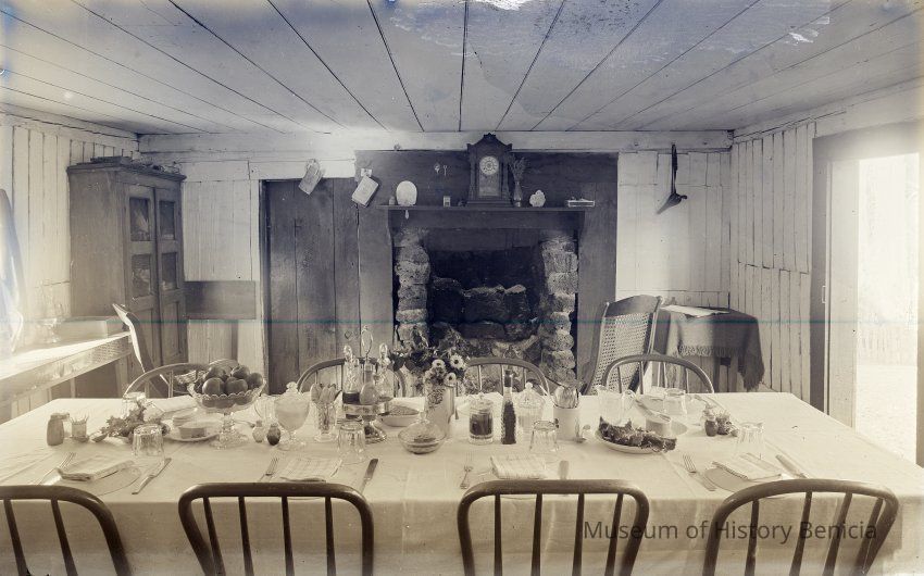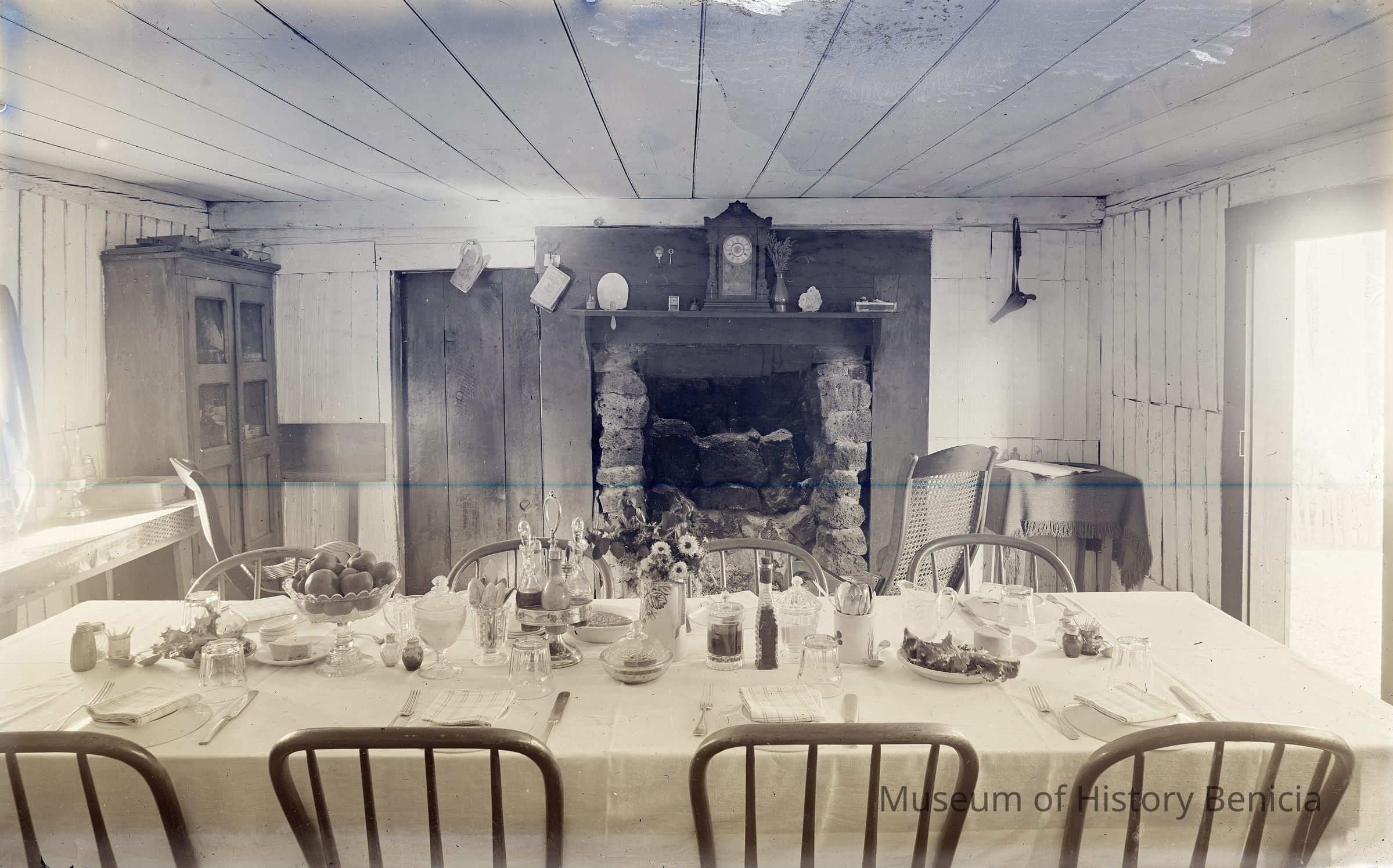 glass plate negative from plate box identified as "box 2" Shows the dinning room in a rough built house (not the Riddell-Fish house in Benicia).Collection