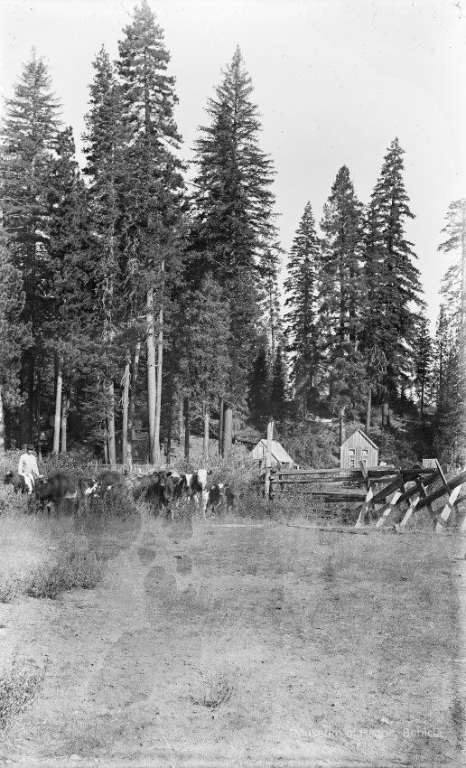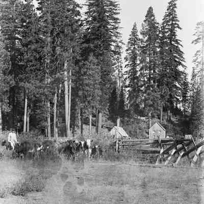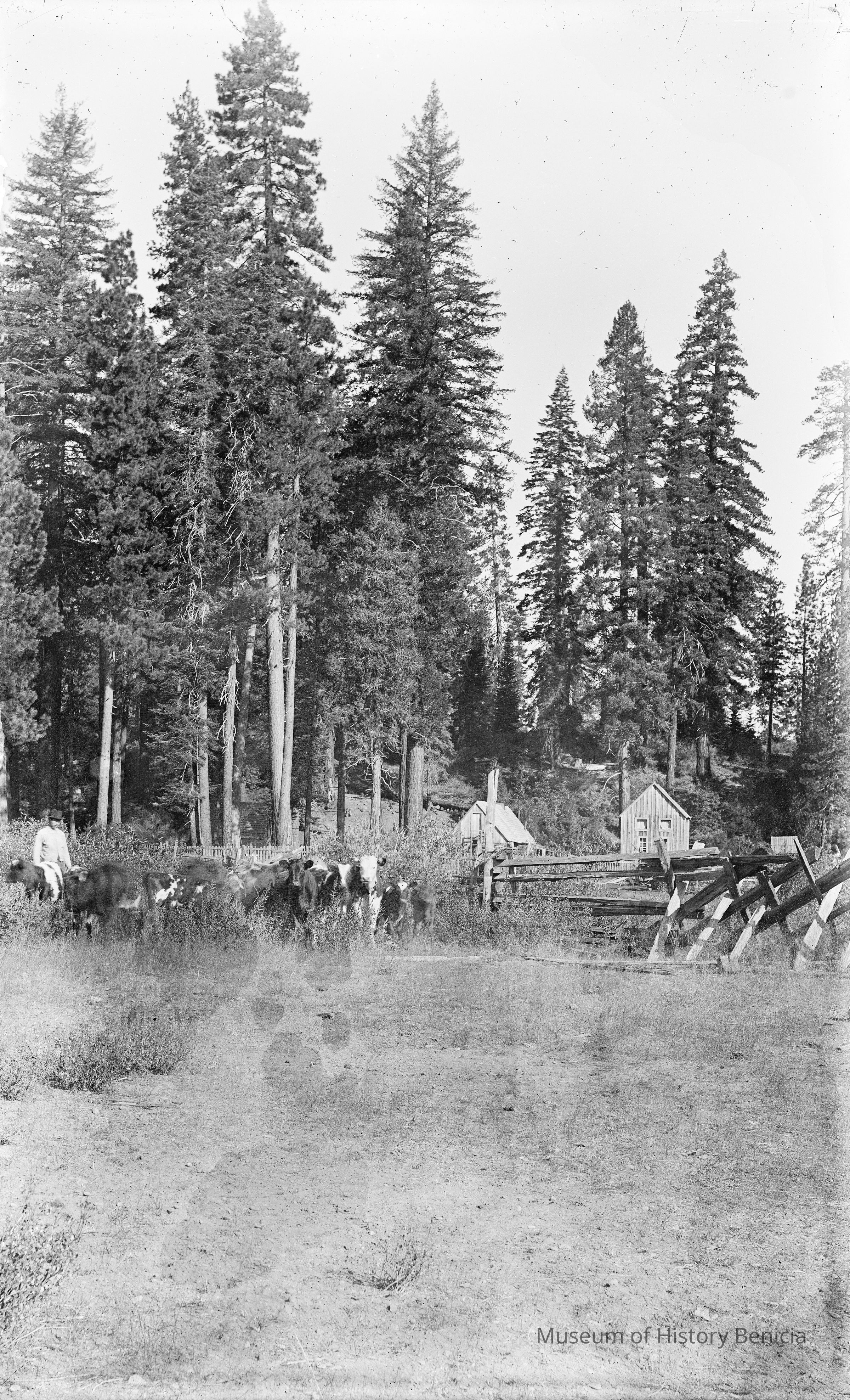 glass plate negative from plate box identified as "box 2" Shows a man herding cattle near a cabin in the woods.