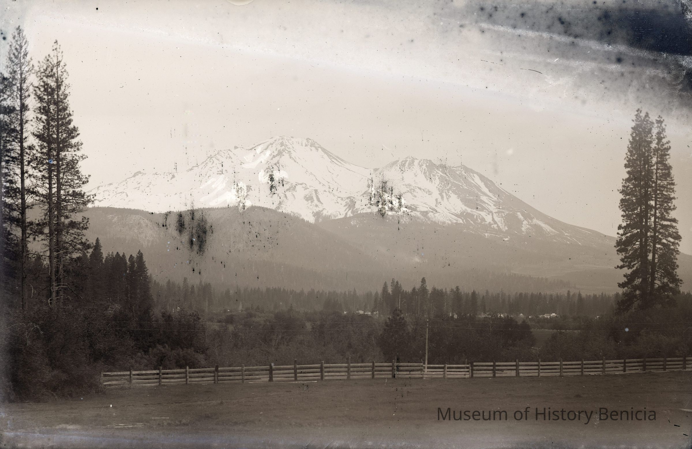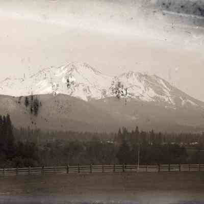 glass plate negative Shows a snow-capped mountain. May be Mt Shasta.