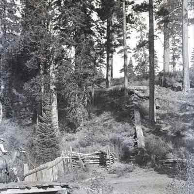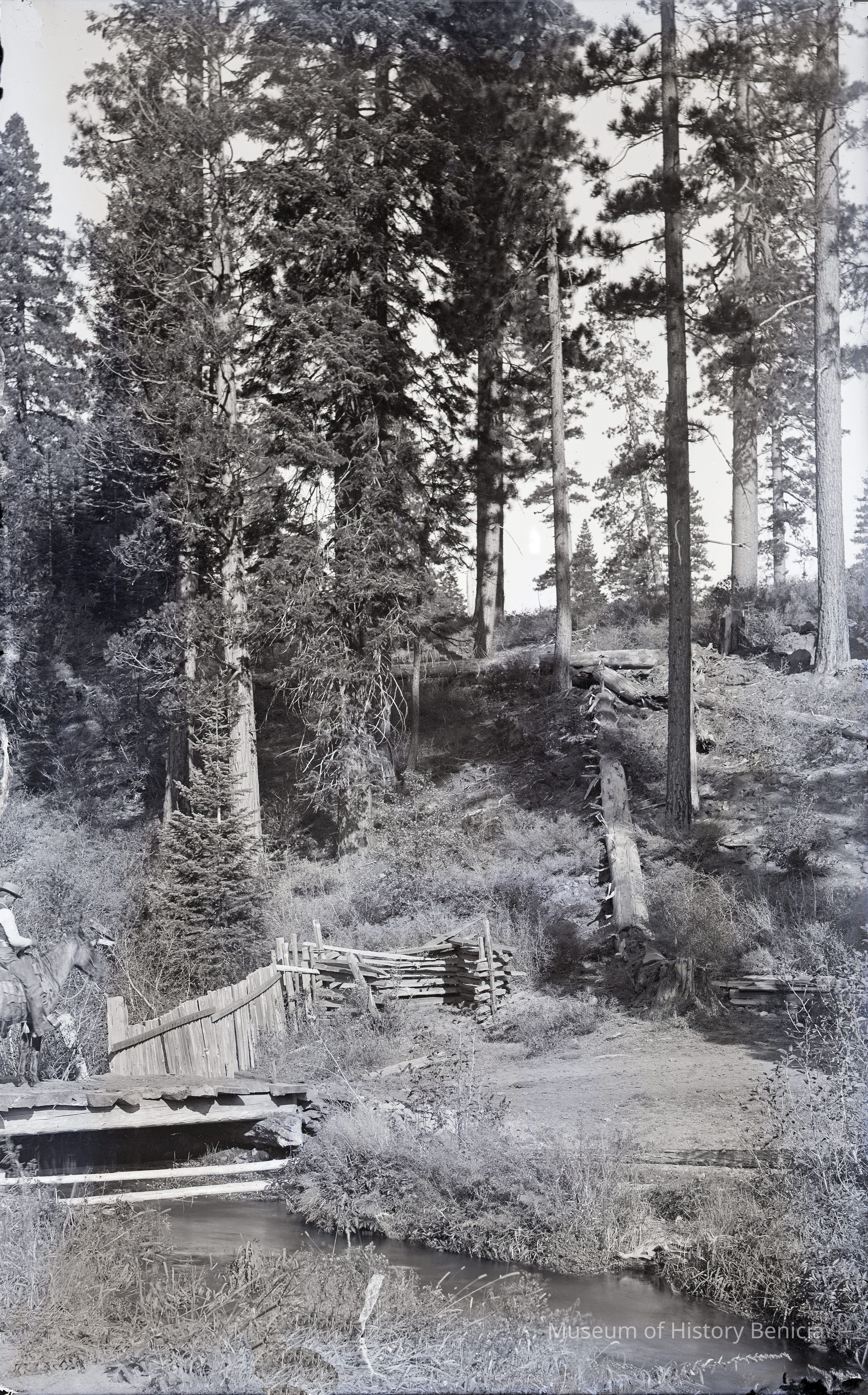 glass plate negative from plate box identified as "box 2" Shows a man on a horse going over a bridge.