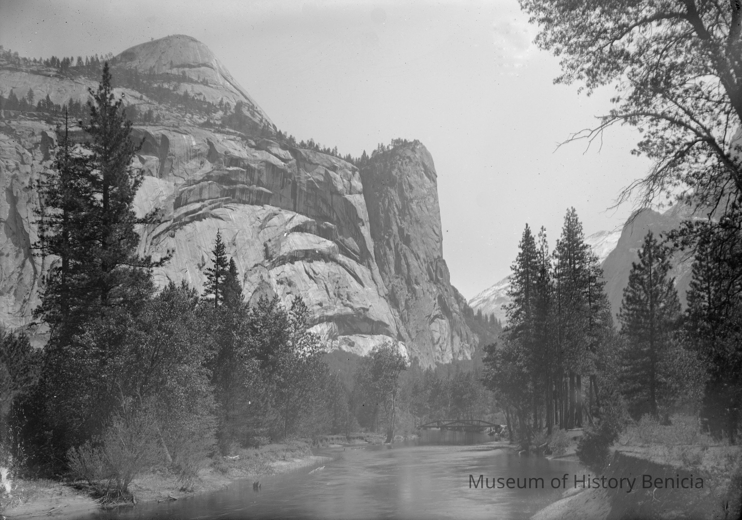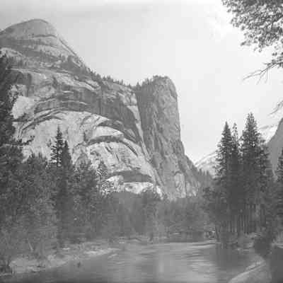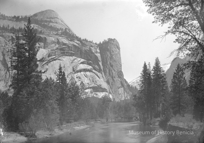 glass plate negative from plate box identified as "box 5". A rocky point behind a river with a bridge over it. This looks like Yosemite.Collection