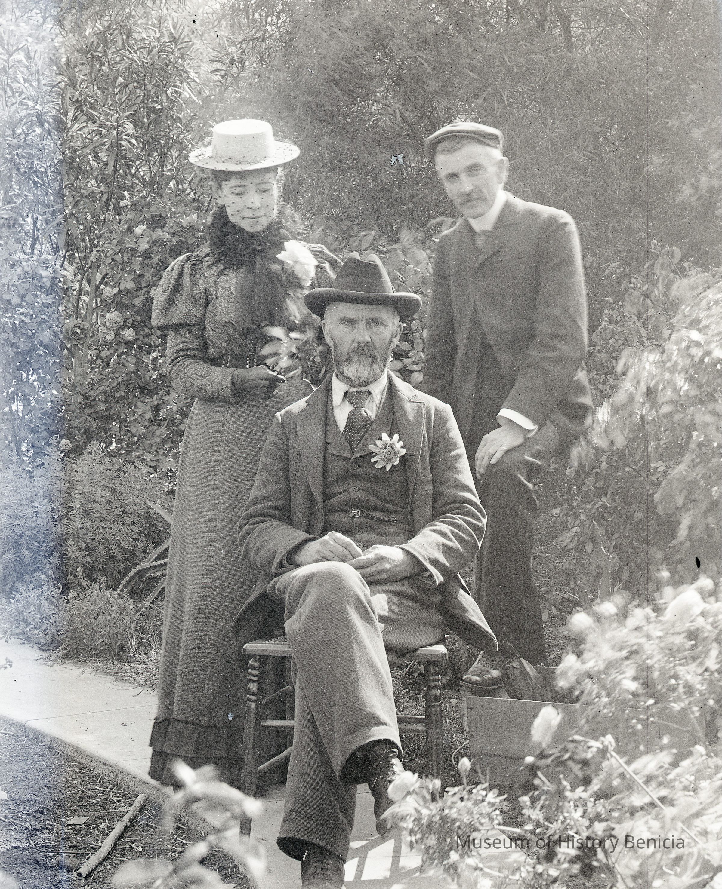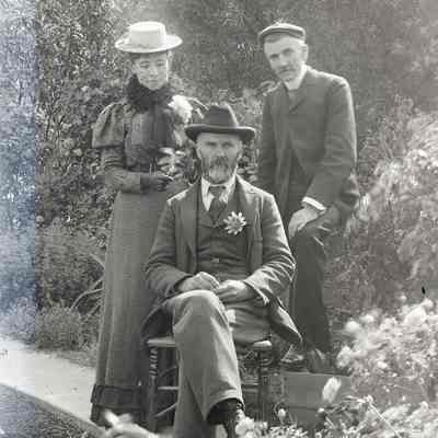 glass plate negative from plate box identified as either Gap Carson or Carmel Cal Photo of Henrietta, Franklin and another man sitting down.Collection