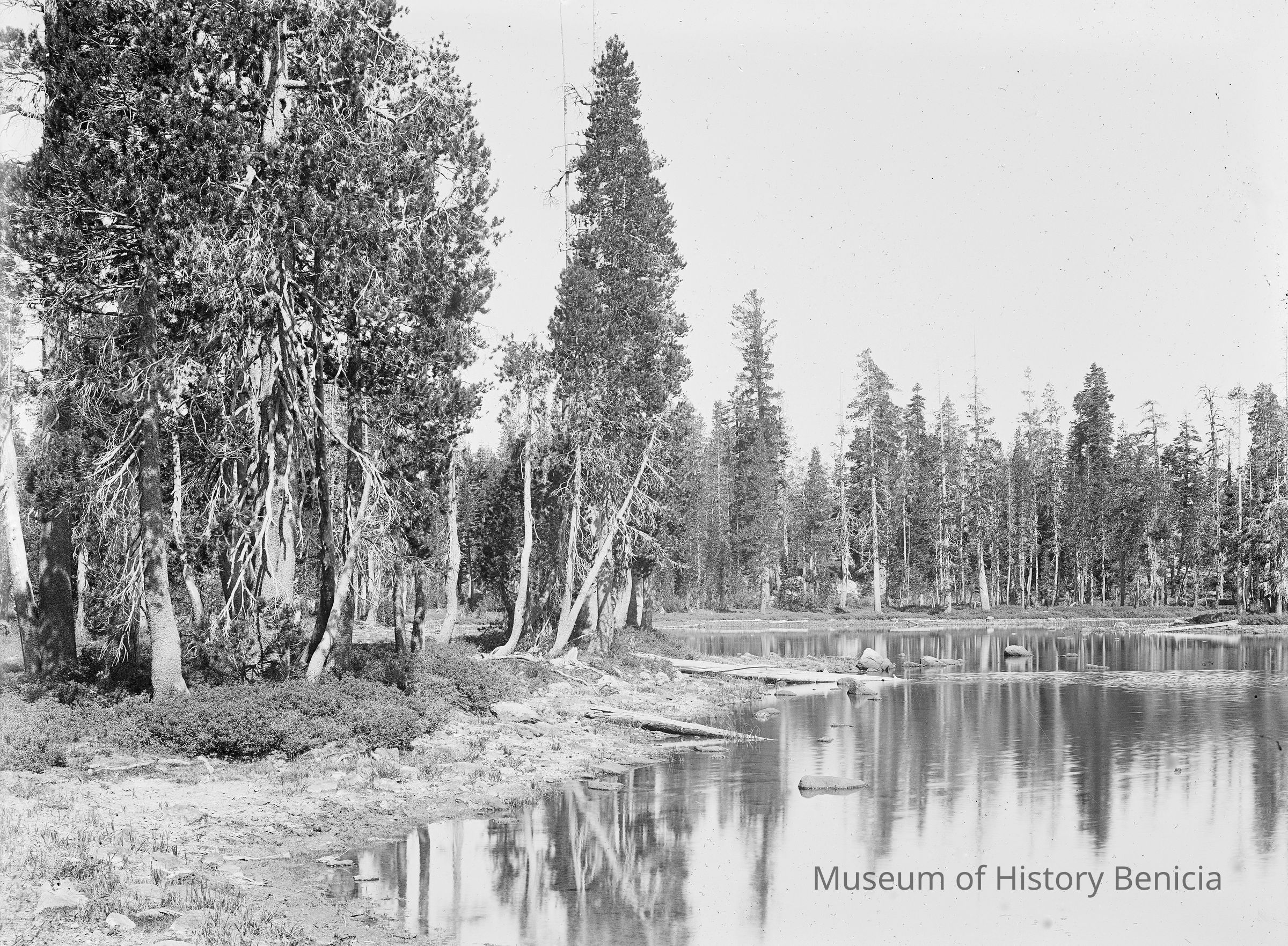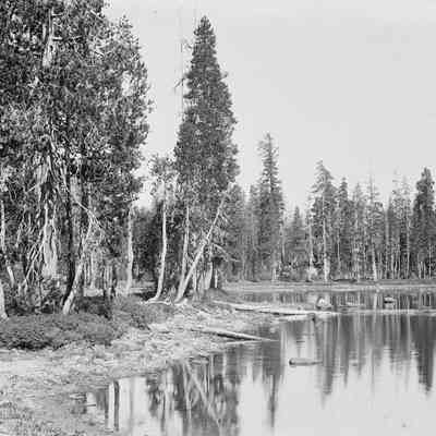 glass plate negative from plate box identified as "box 7" Shows a lake scene with trees. This could be Mirror Lake in Yosemite. There is an edge note "2 Salts Un". This could be a note about how to print the plate.Collection