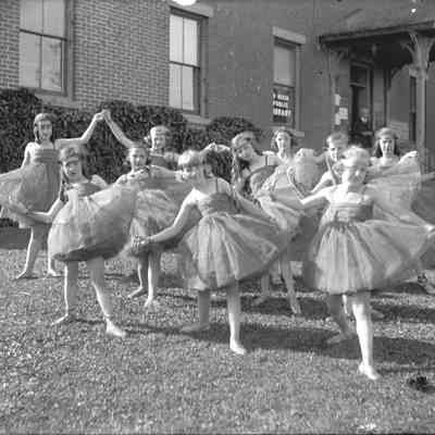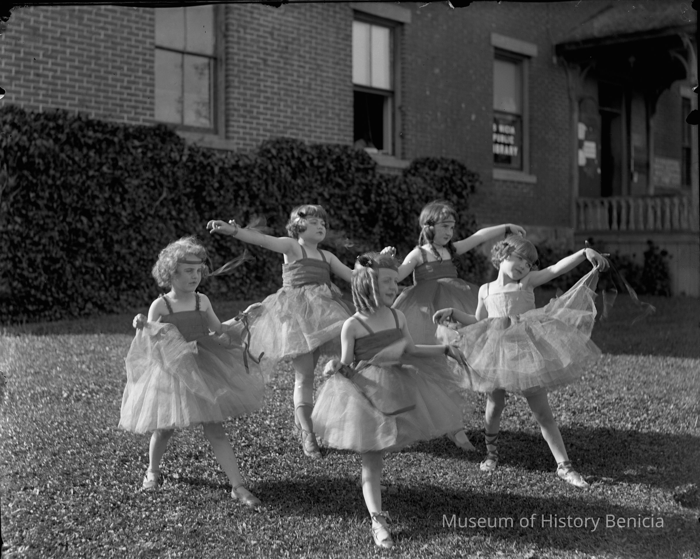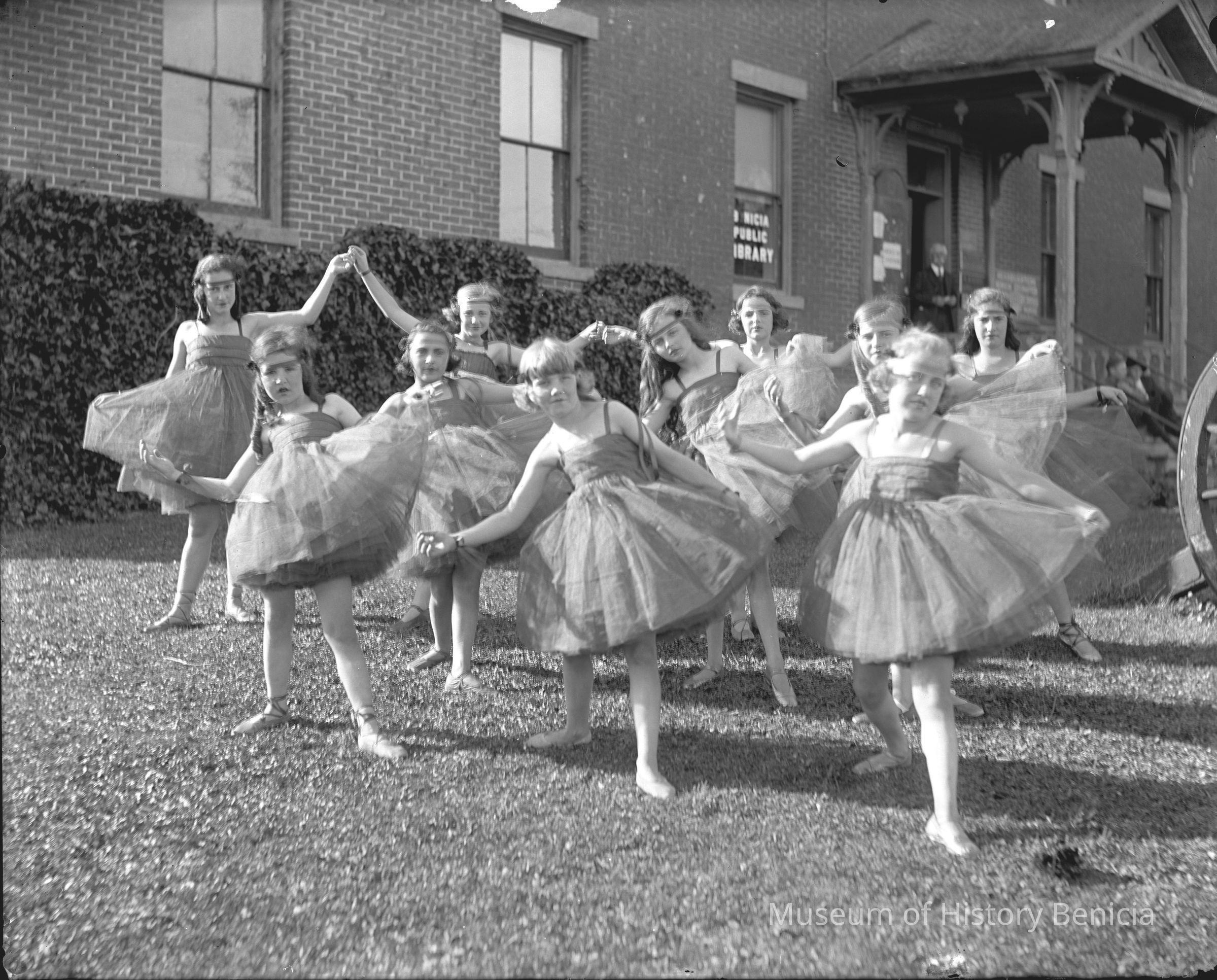Group of young ballerina's on lawn in front of the Benicia Public Library (Capitol building now). There are two full plate glass plate negatives under this same number. They need to be separated into separate items and placed in separate envelopes. The old newspaper and other piece of paper needs to be discarded.