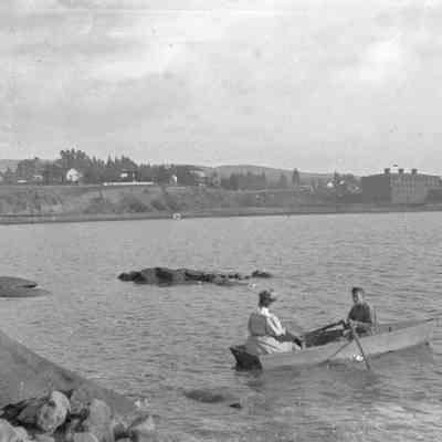 Photo of two men fishing with industrial building in background (tannery?).