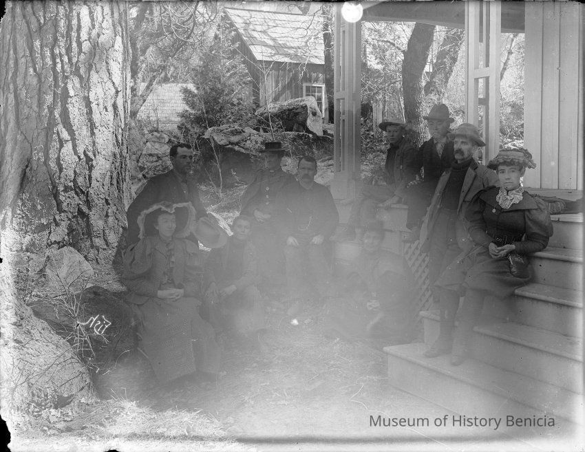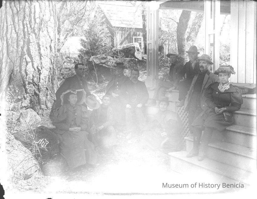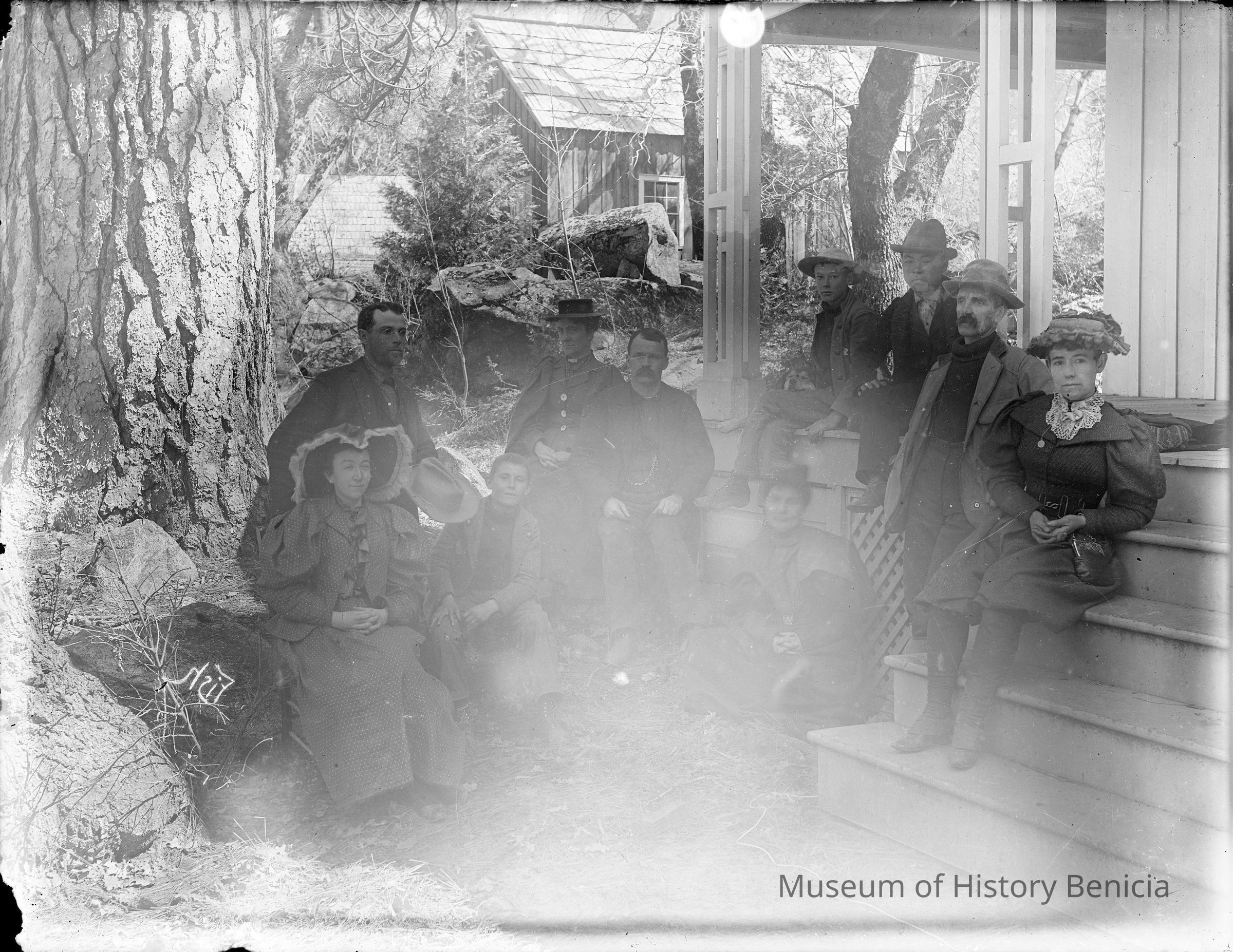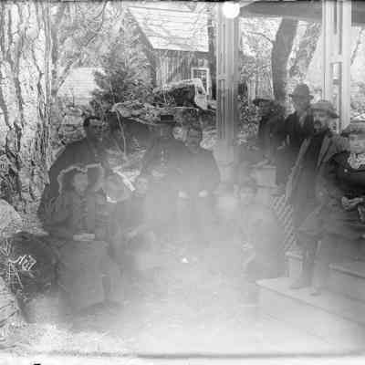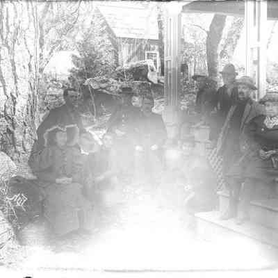 glass plate negative. Shows a group of people sitting on a porch. May be at a lodge. The couple on the right are Henrietta and Franklin Riddell-Fish. Cannot identify the others.Collection