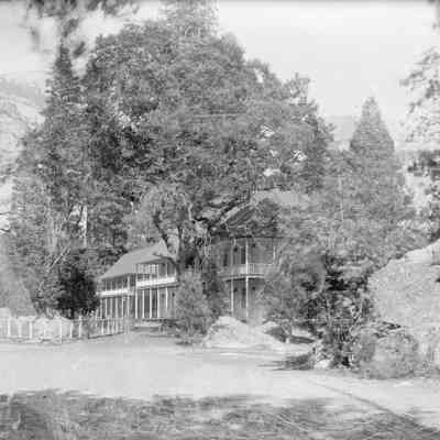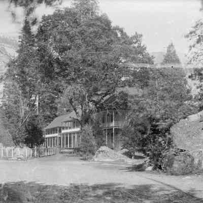 glass plate negative from plate box identified as "box 5". It shows a two story lodge with a curved driveway in front and a fenced in rocky area.