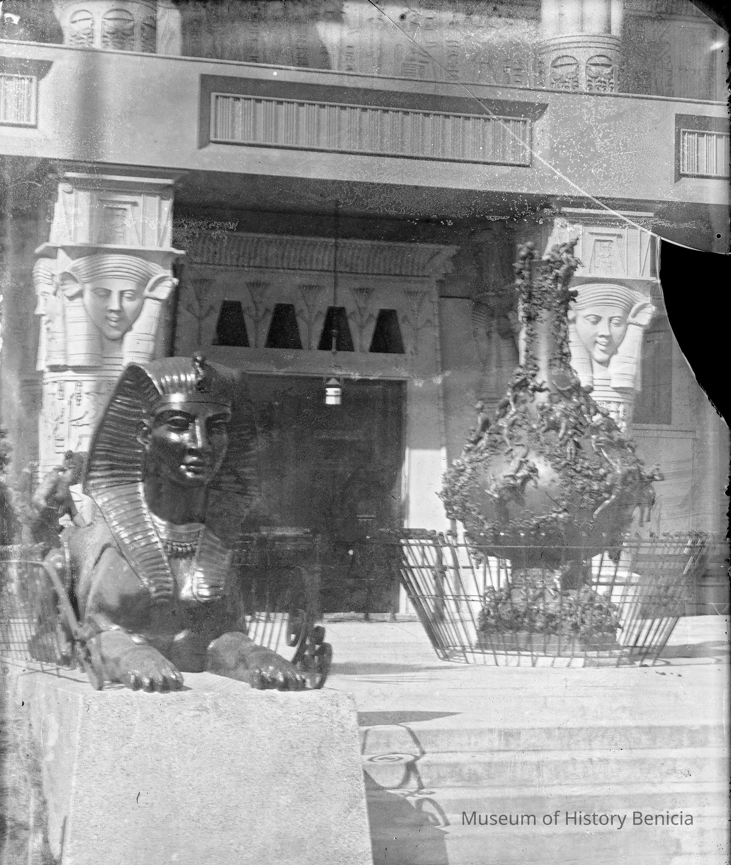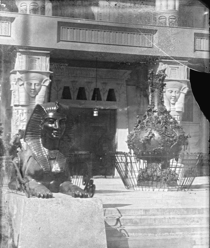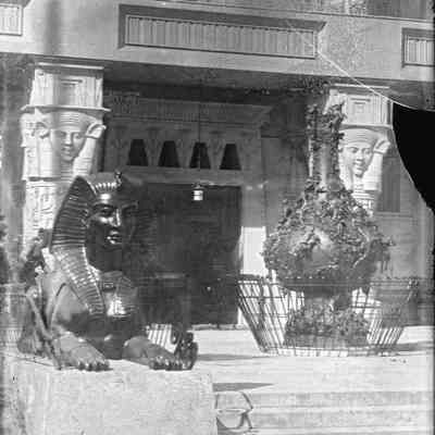 A photo of a staircase with a sphinx statue. May be a building at one of the World's Fairs. Not sure???