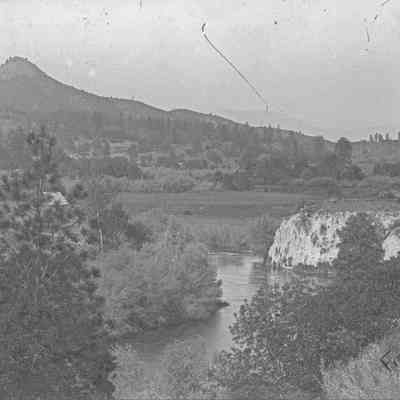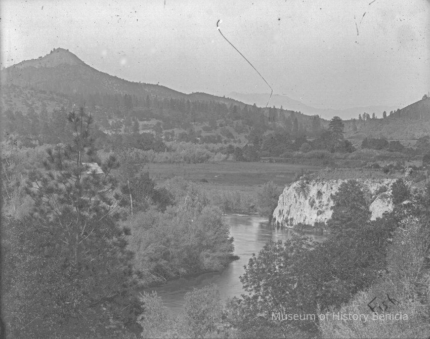 glass plate negative from plate box identified as either Gap Carson or Carmel Cal Photo of woods and hills with a stream in the foreground.Collection