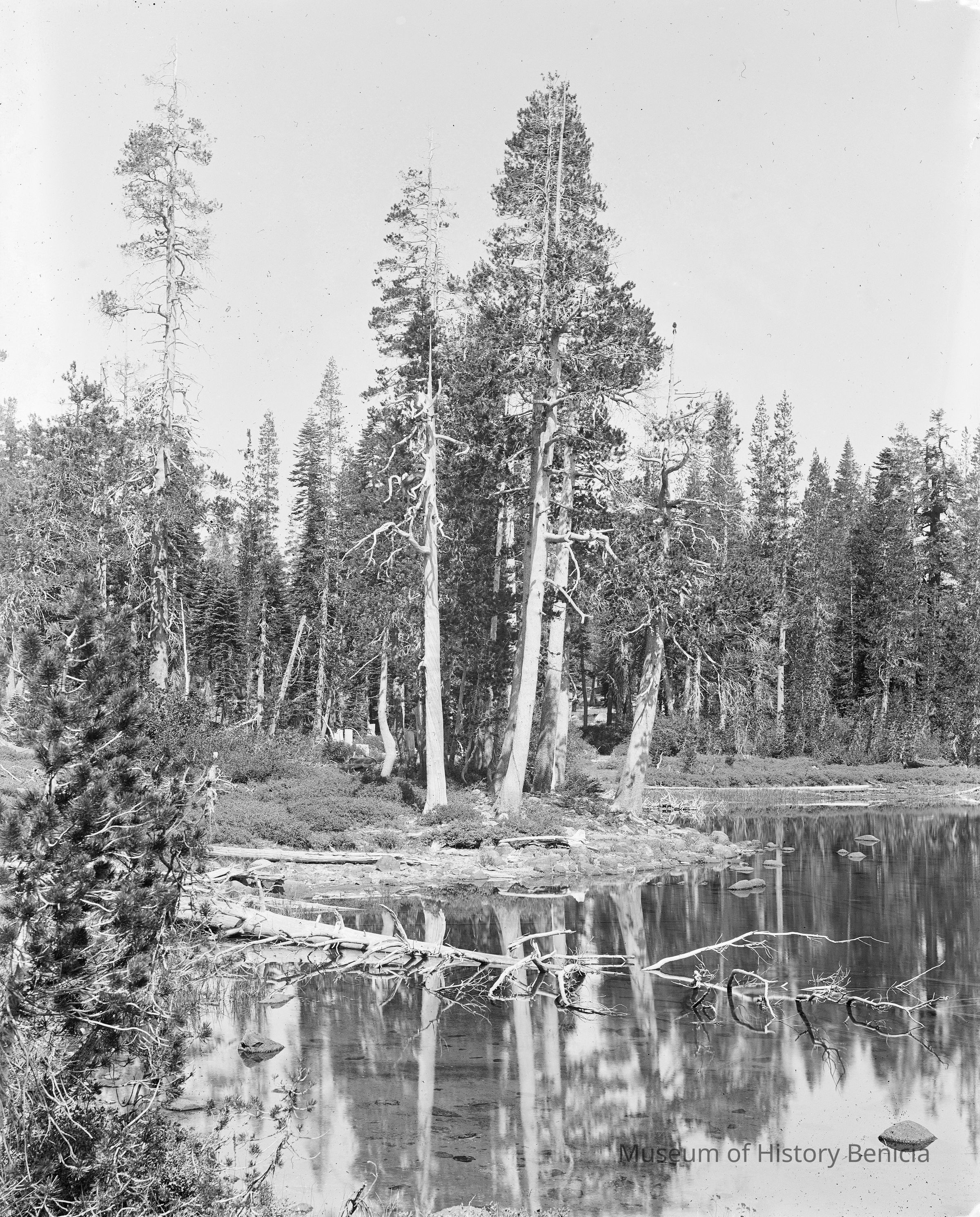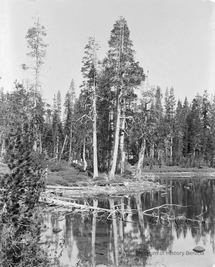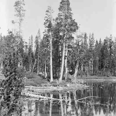 glass plate negative from plate box identified as "box 7" Shows a lake scene with trees. There is an edge note "2 UN".