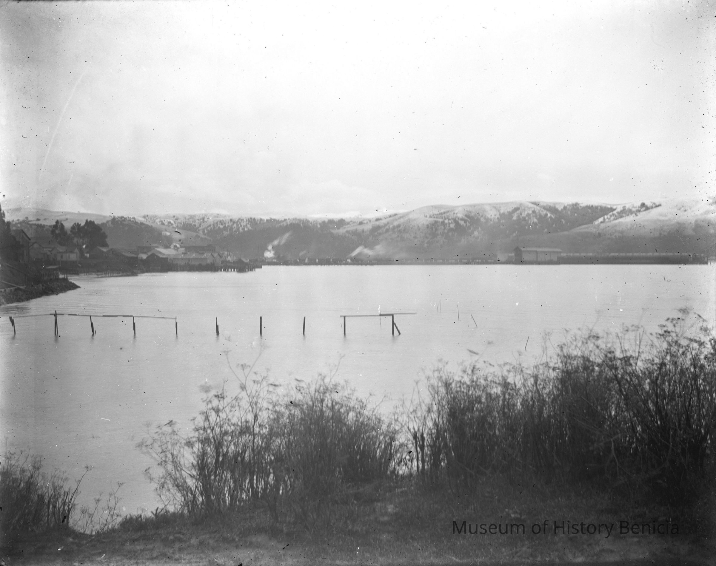 Wharf and Carquinez Strait. Stored in original dry plate box by M.A. feed Dry Plate Co., P.O. Address, St. Louis, MO. Black and white glass negative. From the Estate of Alfred Johnson. Could be a light dusting of snow on the hills.Collection