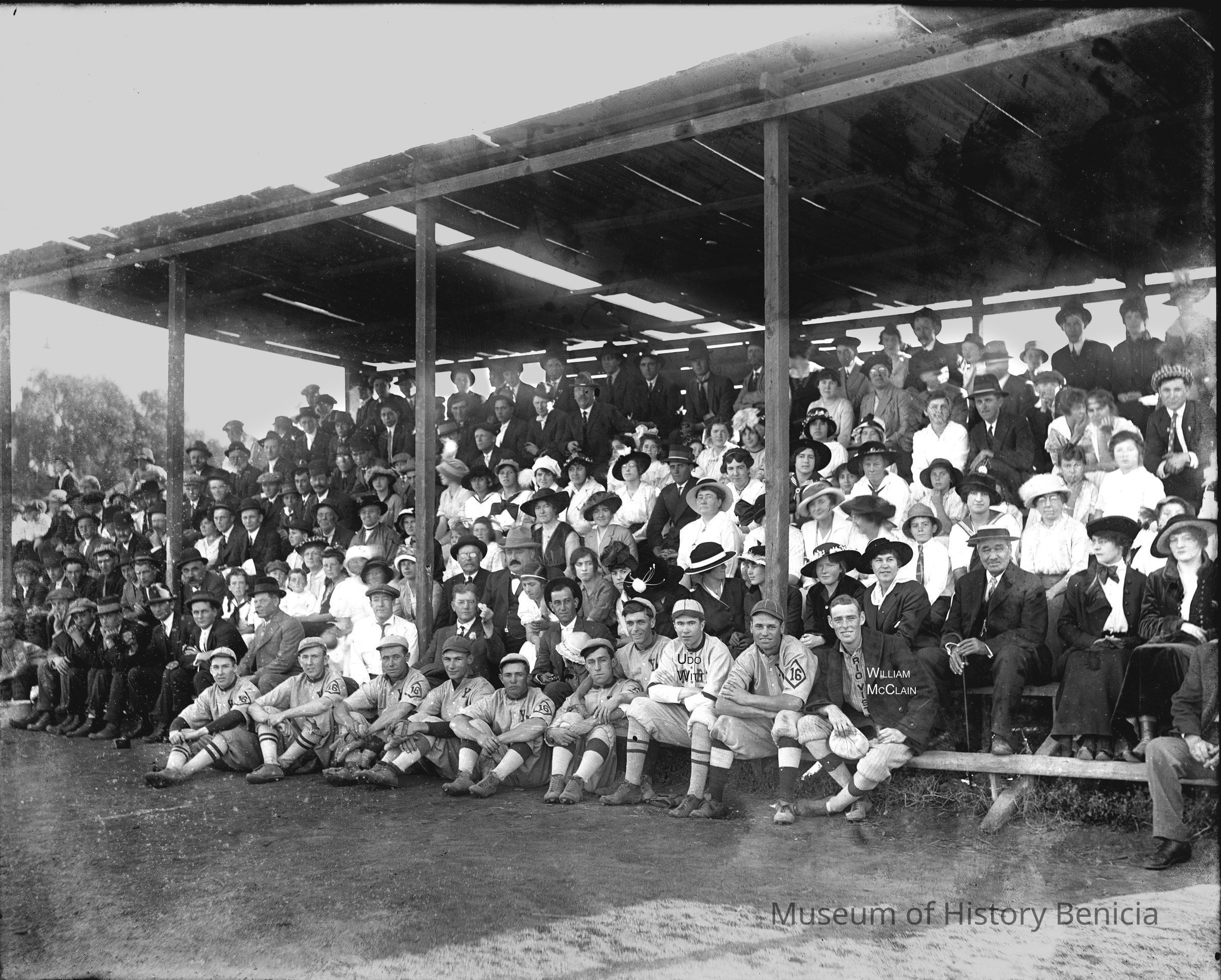 Photo of a baseball team in front of the grandstands. The man on the right sitting on the bench has a shirt that says "Rio Vista" (McClain). The other team players don't seem to have an identifiable team name on their shirts just the number "16". The man in the stands about the third row from the front is holding up two coins.
