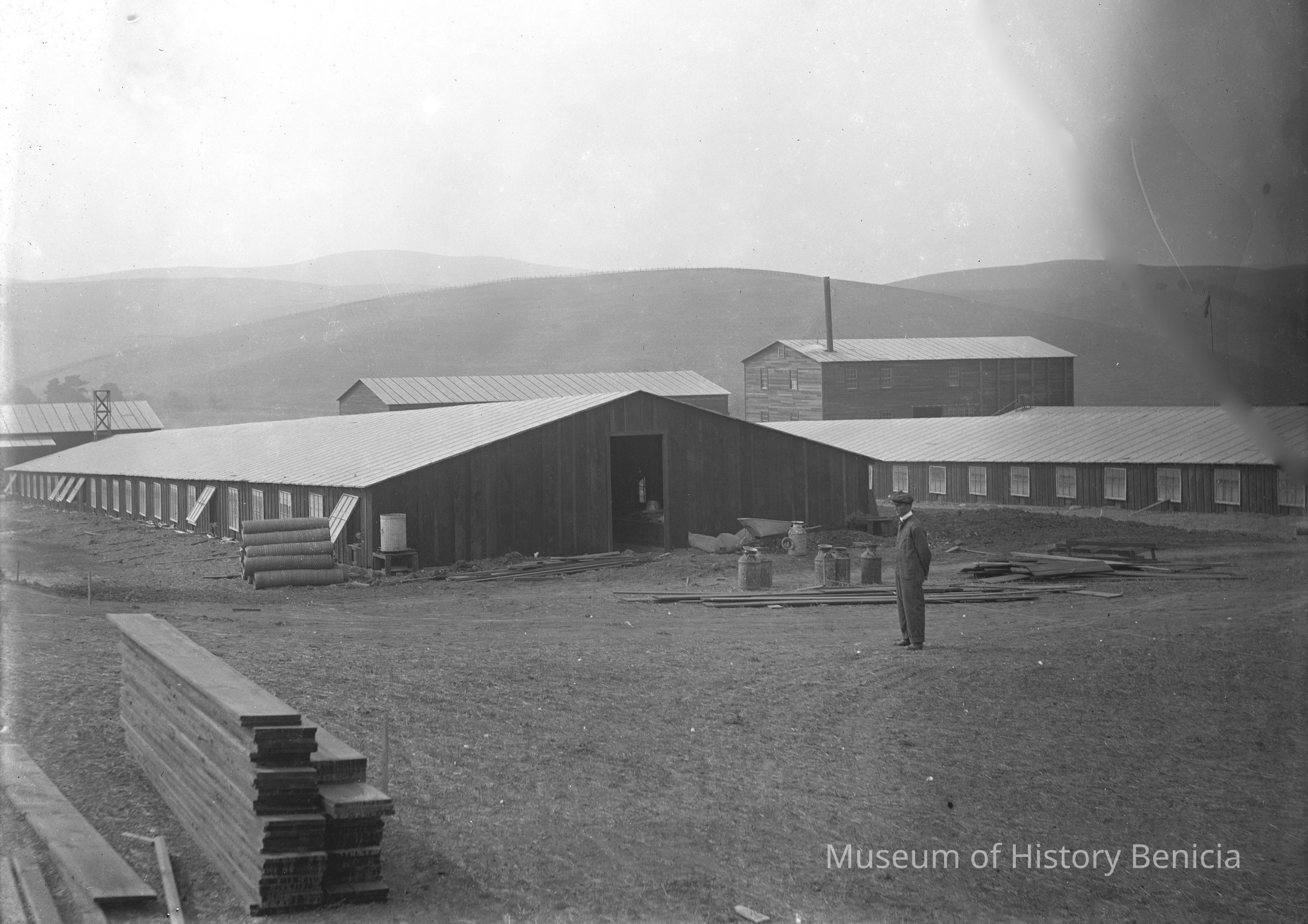 Image of a man standing in front of newly built farm buildings. They look like chicken coops. They have windows for ventilation and you can see small cages inside the closest structure.Collection