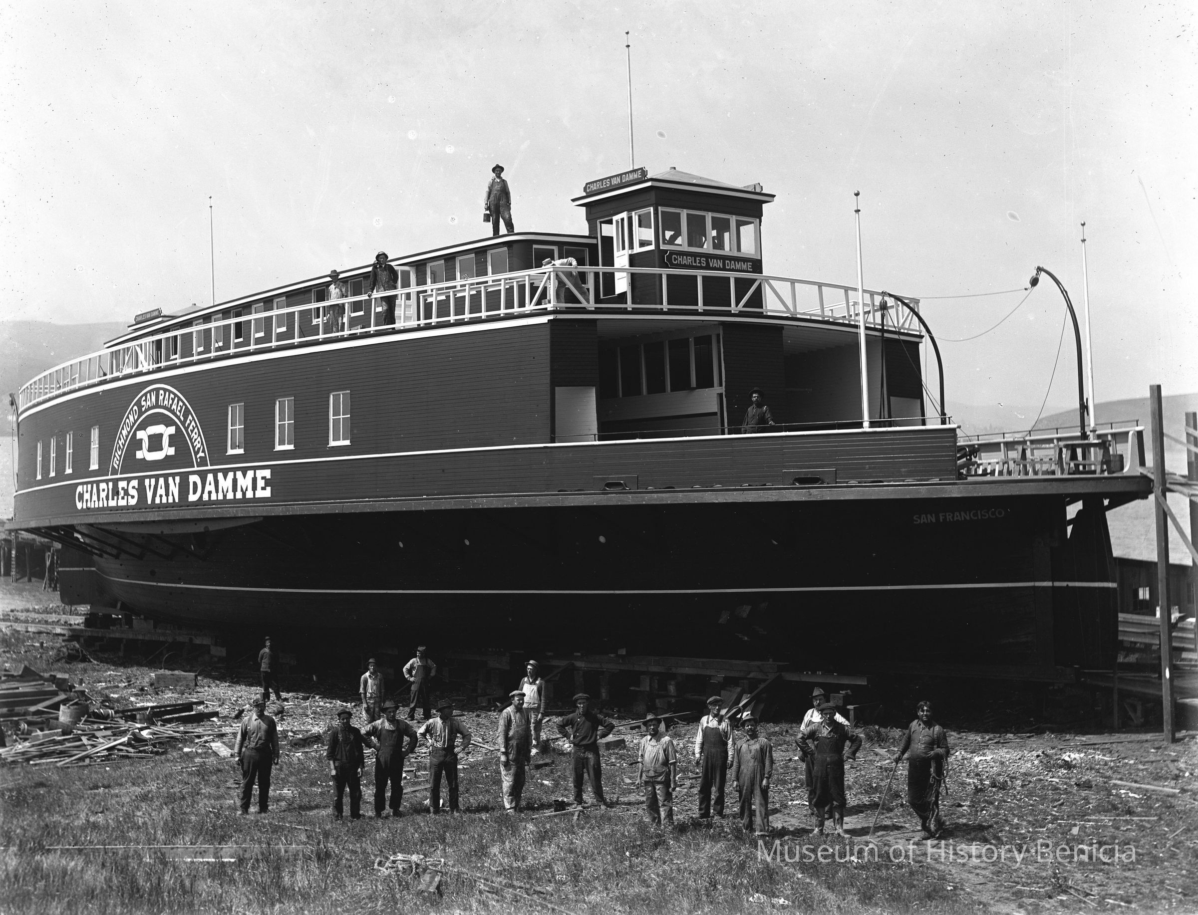This 1916 ferry boat was originally built to carry cars from Marin to Richmond. Later she worked the Martinez-Benicia run and in 1958 was converted into a restaurant at Jack London Square. In 1959 Donlon Arques bought her at auction and brought her to her final resting place at Gate 6 in Sausalito. Here she become home to Juanita's Kitchen and the infamous "Ark". With the restructuring of the Gates Cooperative, we must strive to protect the last remnants of the Charles Van Damme as well as other artifacts on this historic site. The ferry was the first auto ferryboat in the world. She was built at Robertson Shipyards in Benicia.Collection