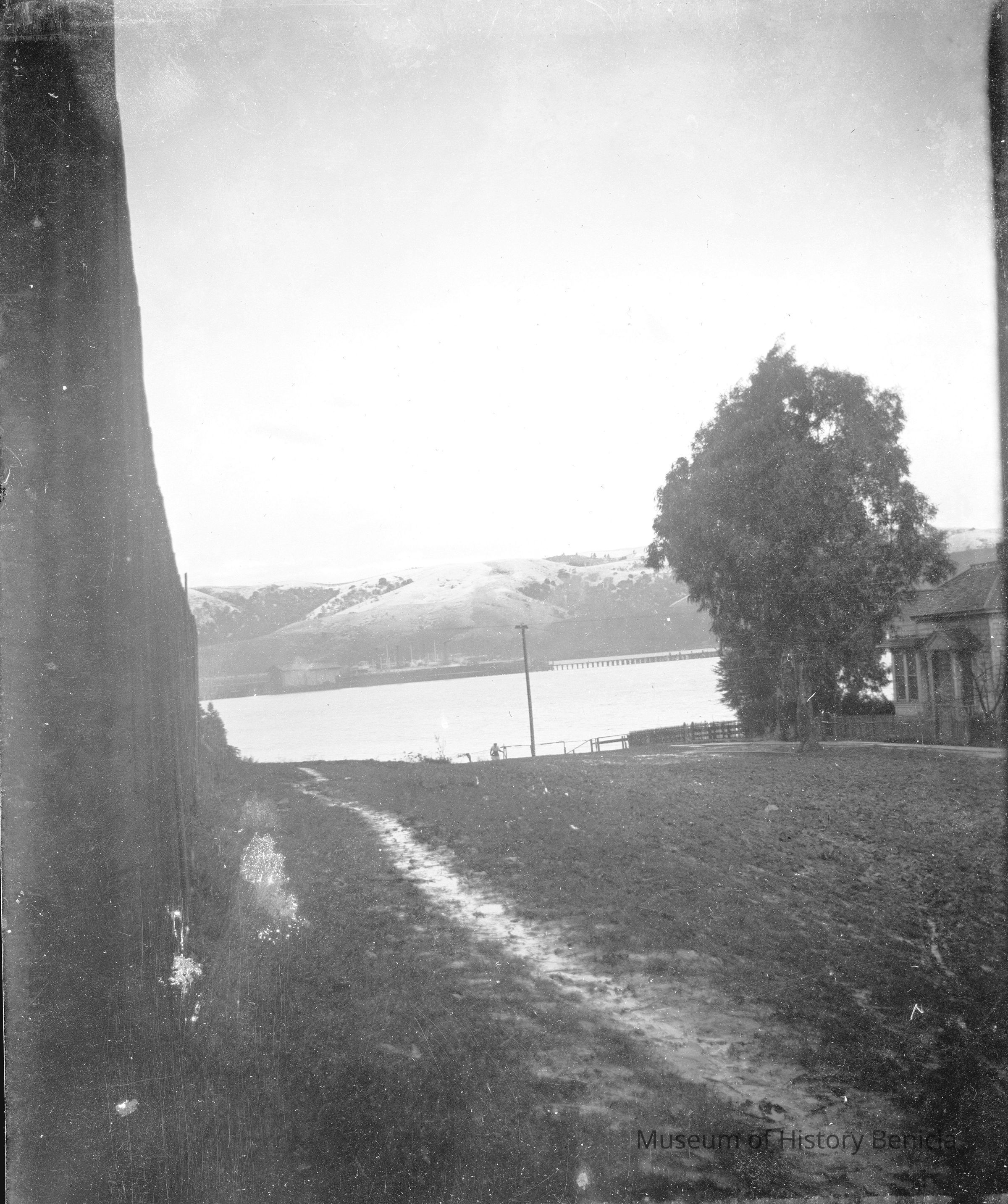 Scene looking towards Straits w/ ships in it. Black and white glass negative. Came from Alfred Johnson Estate.