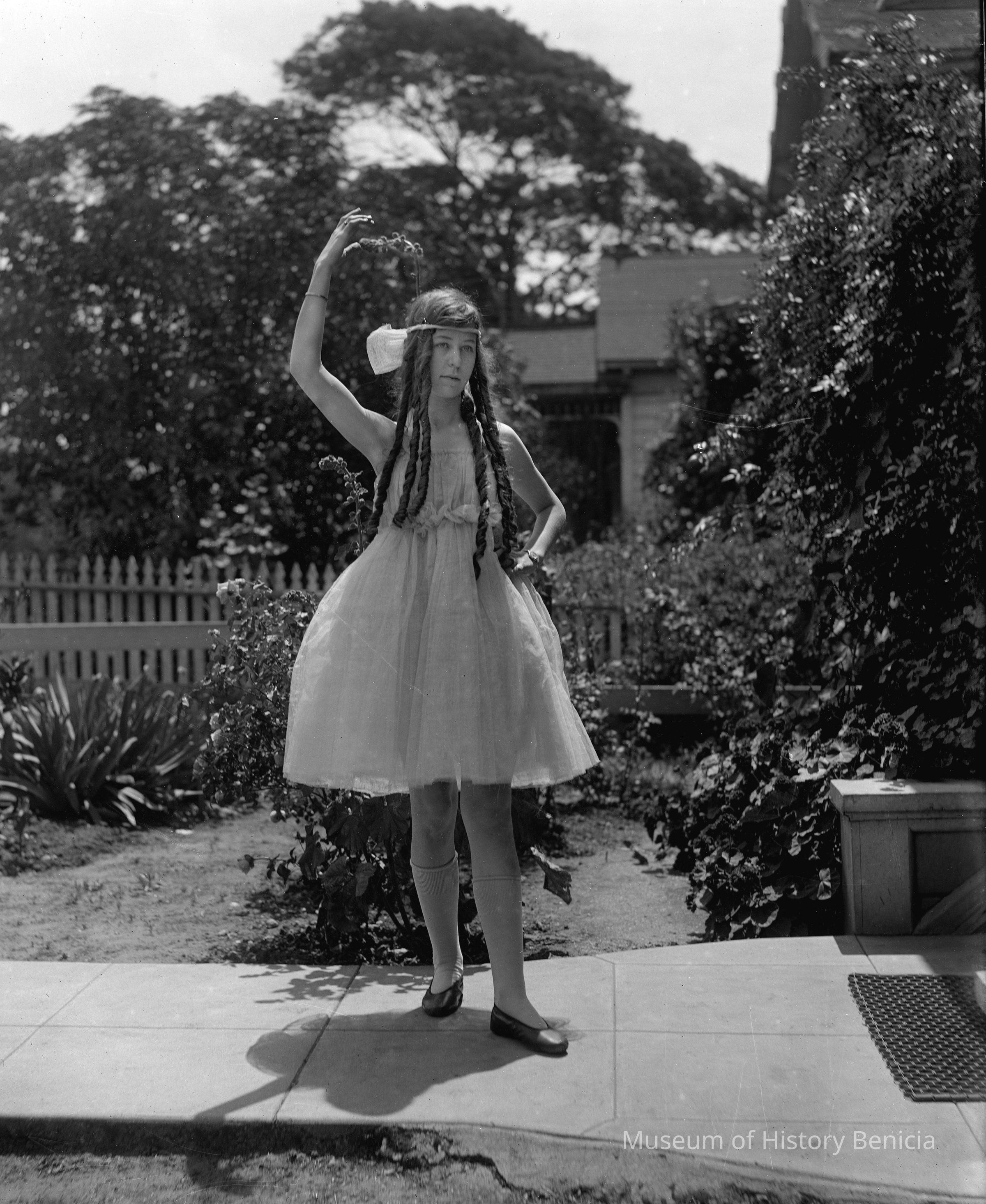 Young woman in costume in front of someone's house.