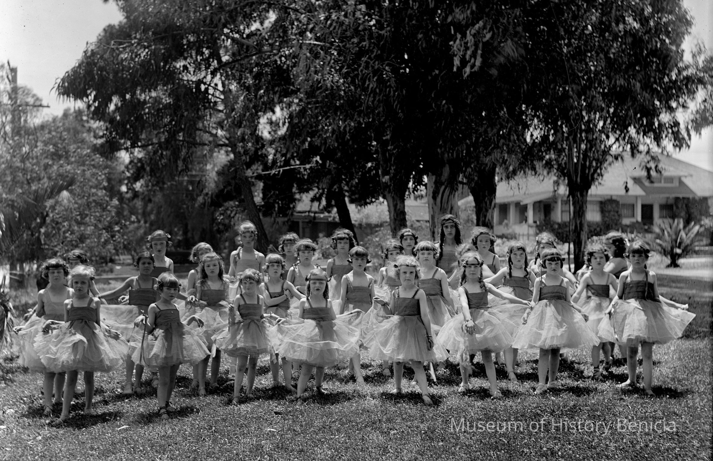 Girls in costume in city park. May be related to Solano History Pagent of 1923.