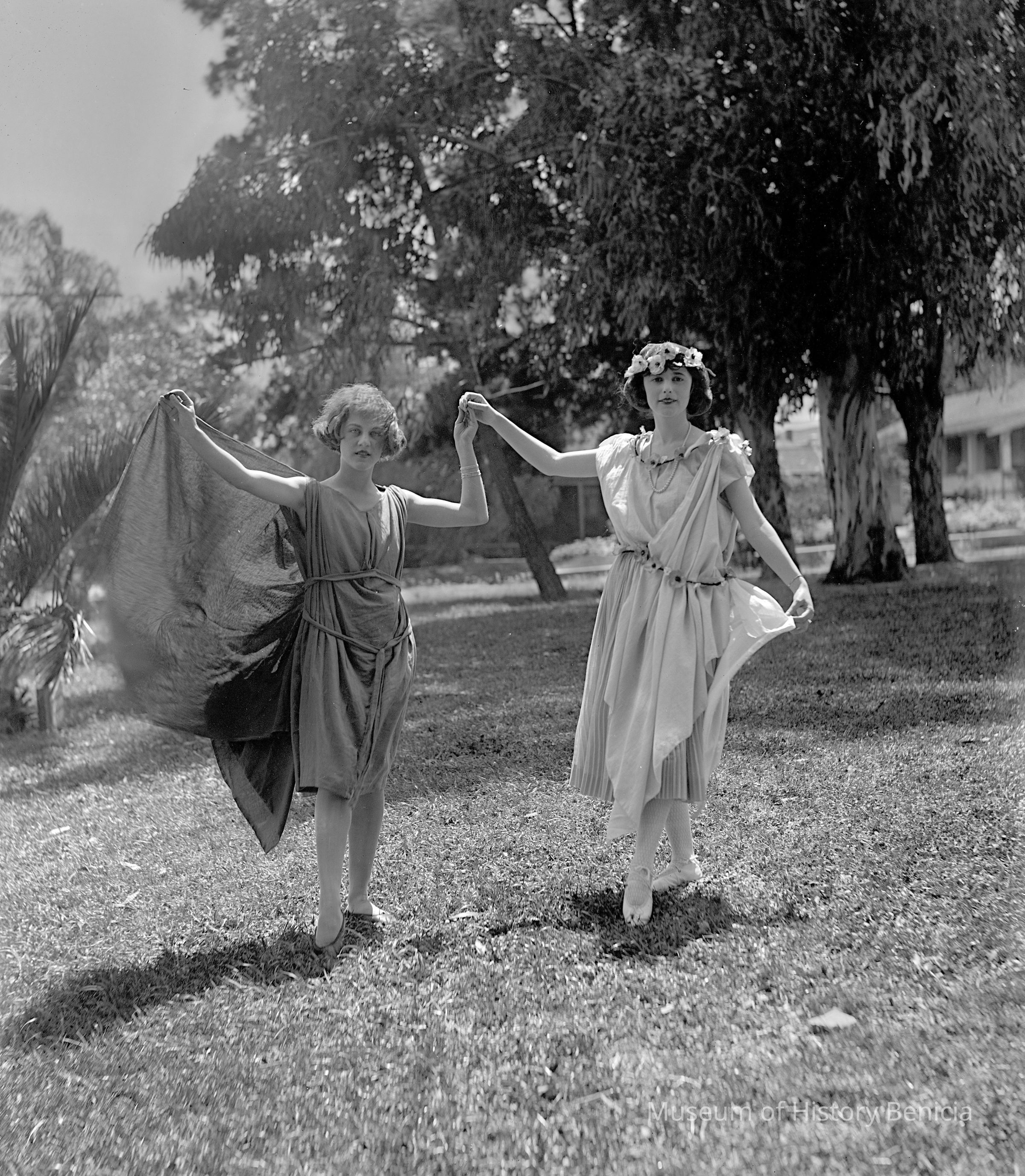 Two young women in costume in city park. May be part of Solano History Pagent.
