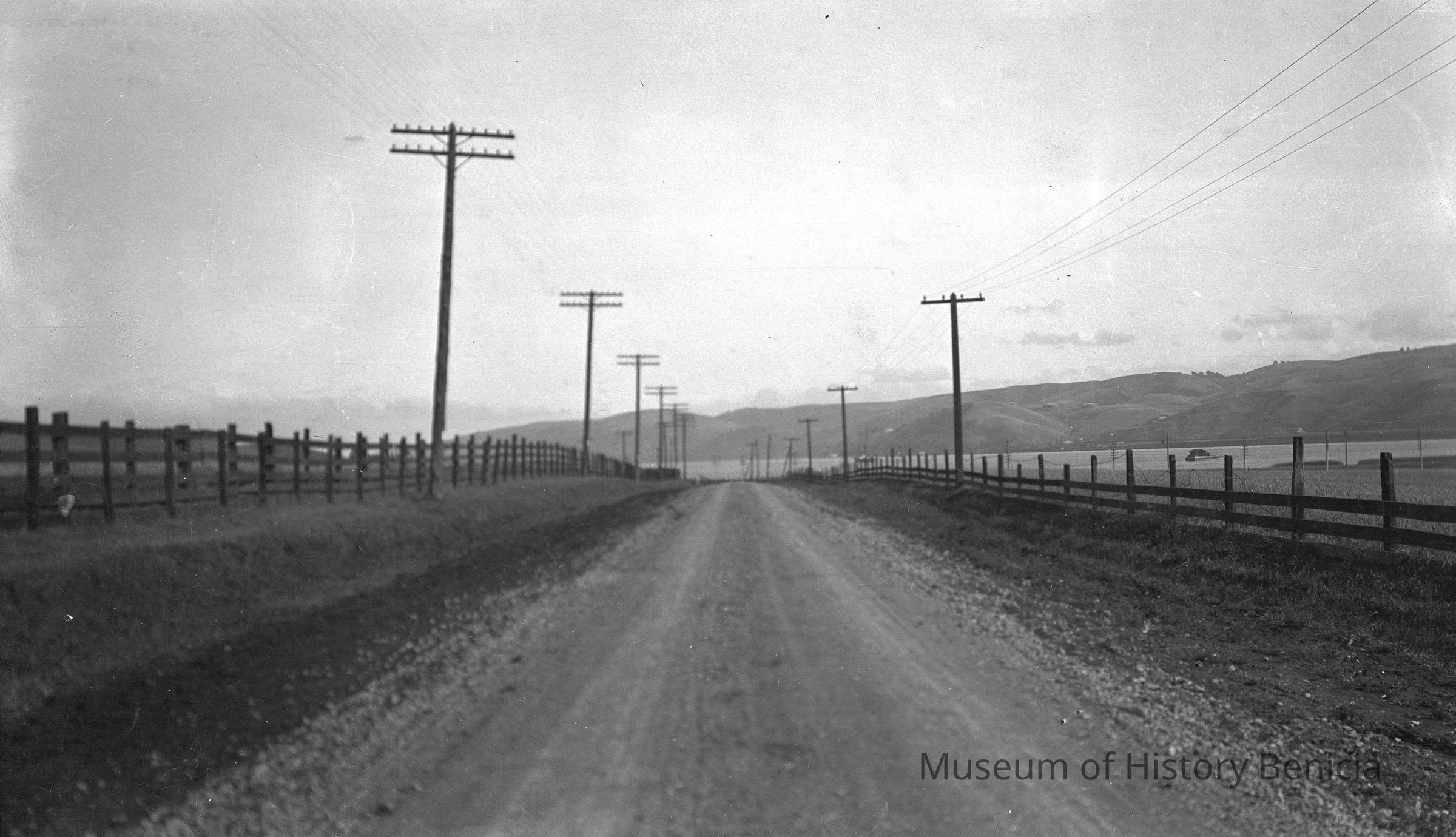 Street scenes Benicia. Road near Carquinez Straits with telephone poles along the side.