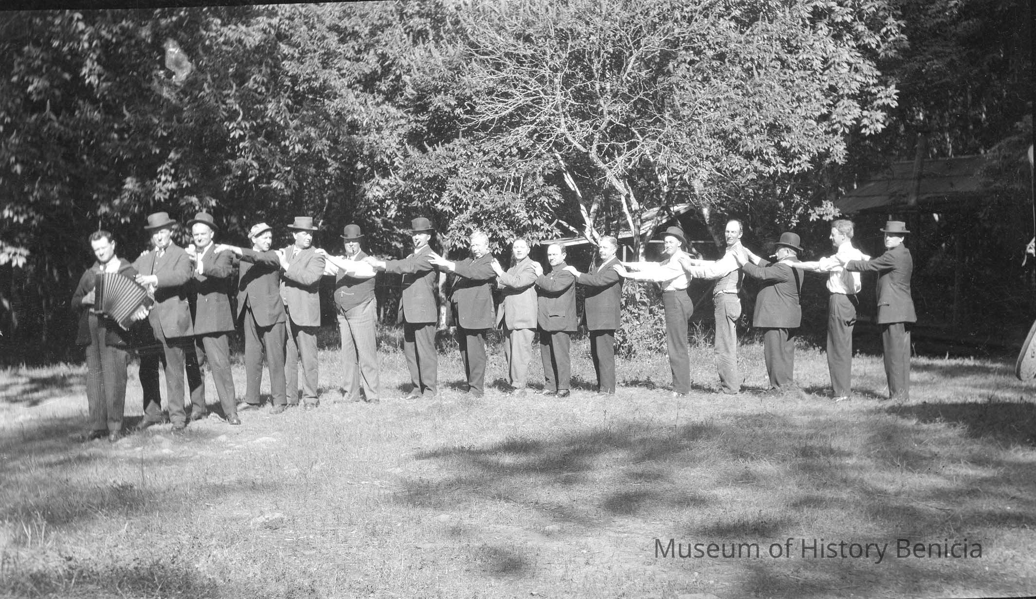 Negative of people in a row on the grass. One has an accordian. This is part of John Molfino's road trip photos.
