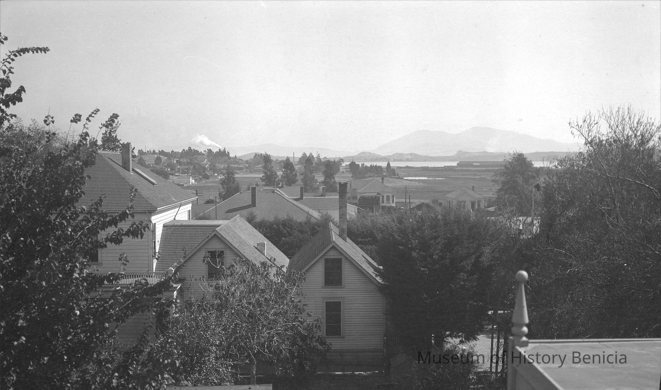 Negative of houses and business in downtown Benicia. View is towards Mt Diablo.