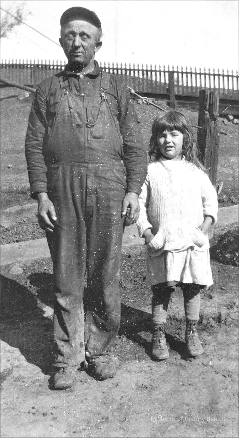Negative of a man and a girl by a fence.