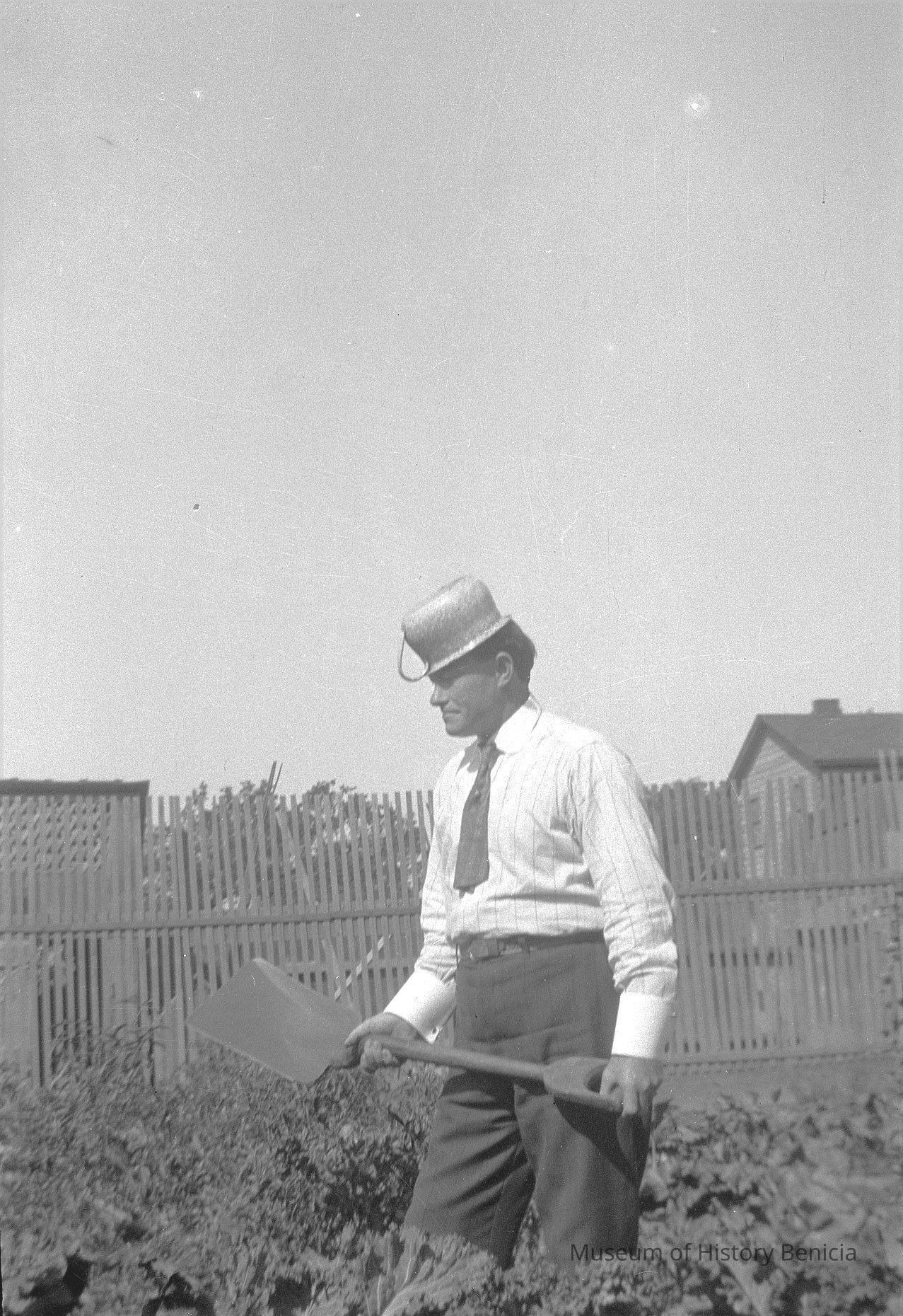 Negative of a man in the garden with a pot on his head.