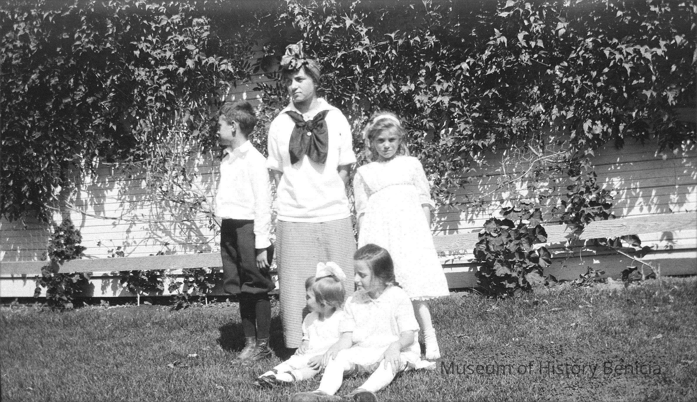 Negative of four kids and an older young woman in the yard.